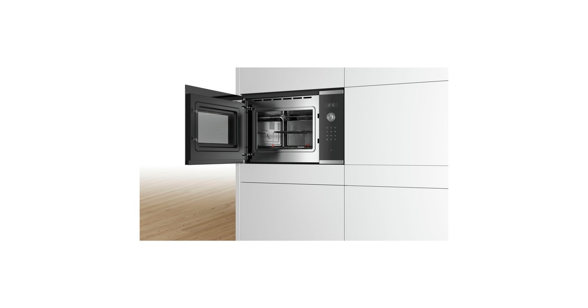 Die Einbau-Mikrowelle Bosch BEL554MS0 mit Grillfunktion überzeugt mit schickem Design und umfangreichen Funktionen. Die Bosch BEL554MS0 bietet 25 Liter Garraumvolumen. Die Mikrowelle verfügt über eine Leistung von 900 Watt und der Grill über 1200 Watt. Über den intuitiven Bedienring lassen sich fünf Leistungsstufen einstellen und mit acht Automatikprogrammen bleiben für den Anwender keine Wünsche mehr offen. Daneben verfügt die BEL554MS0 über eine LED-Innenbeleuchtung und durch das Sichtfenster bleibt das Gargut immer gut im Blick. In puncto Sicherheit bietet die BEL554MS0 zudem eine Sicherheitsabschaltung, einen Türkontaktschalter sowie ein Kühlgebläse.Art.-Nr.: 1384580