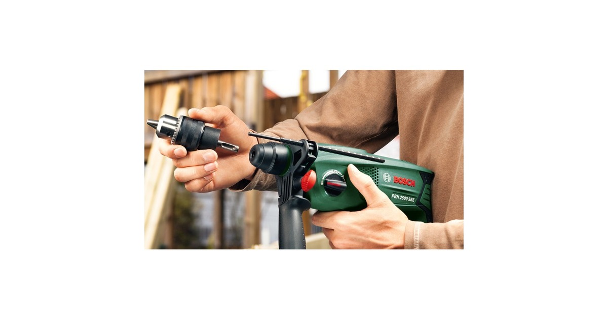 Der Bohrhammer PBH 2500 SRE "Compact" von Bosch ist ein besonders handlicher Bohrhammer mit viel Power zum Bohren in Fliesen, Holz und Metall, zum Schrauben und zum Hammerbohren in Beton und Mauerwerk. Das pneumatische Hammerwerk mit 1,9 Joule Schlagstärke sorgt für hohe Schlagkraft in harten Materialien unabhängig vom Anpressdruck. Nur 2,2 kg Arbeitsgewicht und das kompakte Slimline-Design des Bohrhammer PBH 2500 SRE "Compact" mit Softgrip ermöglichen ein ermüdungsarmes Arbeiten. Das Einsatzwerkzeug lässt sich dank SDS-Plus-Werkzeugaufnahme sehr schnell und ohne zusätzlichen Schlüssel wechseln. Neben der SDS plus-Werkzeugaufnahme verfügt der PBH 2500 SRE auch über ein Zahnkranz-Bohrfutter, so dass man auch normale Bohrer und Bits einsetzen kann, beispielsweise zum Verschrauben bei der Möbelmontage.Art.-Nr.: 1620596
