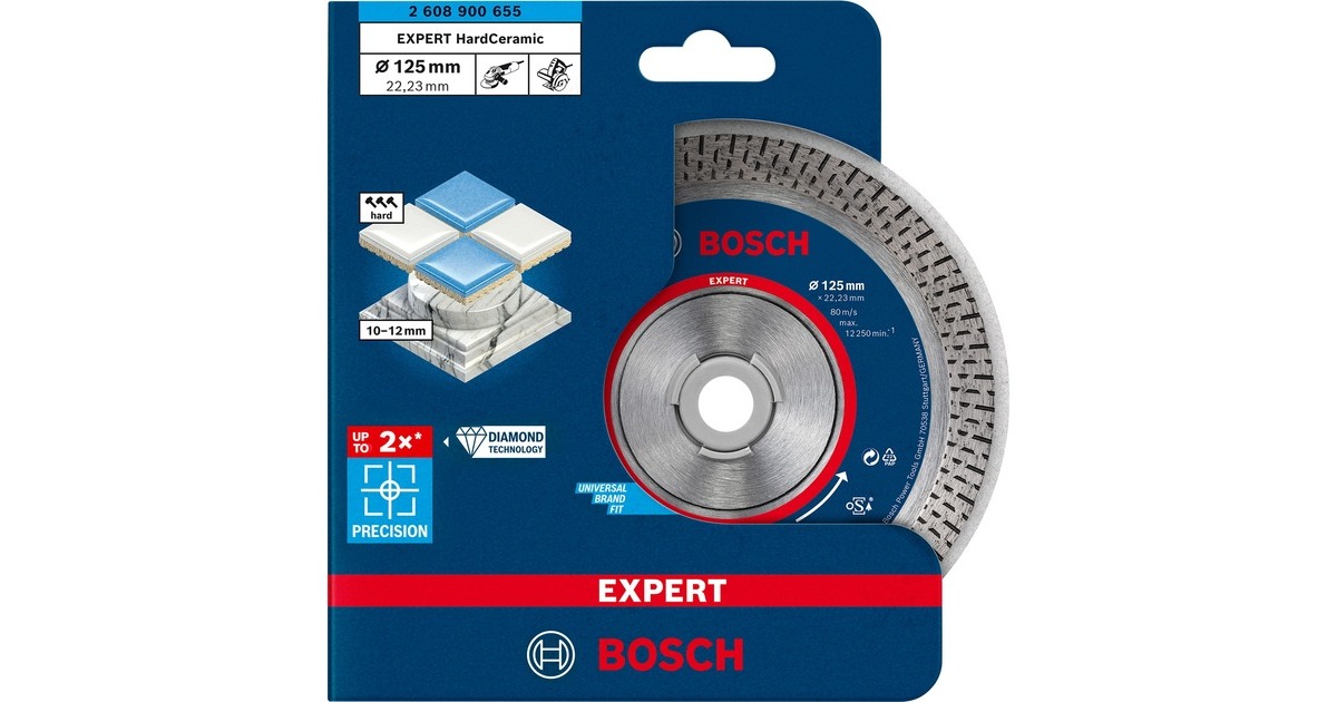 Die Diamant-Trennscheibe 'Expert HardCeramic' 2608900655 von Bosch macht besonders saubere Schnitte in härtestes Porzellan, harte Fliesen, Steingut und Feinsteinzeug. Die auf modernen Baustellen verwendeten Fliesen sind häufig groß, sehr hart und teuer. Es ist daher wichtig, sie jedes Mal perfekt zu schneiden, auch wenn es schwierig ist. Die 'Expert HardCeramic' Diamant-Fliesentrennscheibe verwendet Diamond Technology und ein einzigartiges Design, um konstant die besten Ergebnisse zu liefern, selbst in härtester Keramik. Die dünnen Blätter trennen effizienter, bleiben dadurch kühler, und die verstärkte Mitte reduziert die Vibrationen, für einen saubereren Schnitt. Mit 22,23mm Bohrungsdurchmesser eignet sie sich für Standard Winkelschleifer mit Spannmutter.Art.-Nr.: 1776622