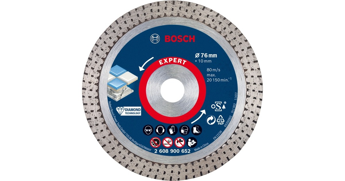Die Diamant-Trennscheibe 'Expert HardCeramic' 2608900652 von Bosch macht besonders saubere Schnitte in härtestes Porzellan, harte Fliesen, Steingut und Feinsteinzeug. Die auf modernen Baustellen verwendeten Fliesen sind häufig sehr hart und teuer. Es ist daher wichtig, sie jedes Mal perfekt zu schneiden, auch wenn es schwierig ist. Die 'Expert HardCeramic' Diamant-Fliesentrennscheibe verwendet Diamond Technology und ein einzigartiges Design, um konstant die besten Ergebnisse zu liefern, selbst in härtester Keramik. Die dünnen Blätter trennen effizienter, bleiben dadurch kühler, und die verstärkte Mitte reduziert die Vibrationen, für einen saubereren Schnitt. Die Ø 76mm Trennscheibe eignet sich für Mini-Winkelschleifer.Art.-Nr.: 1769542