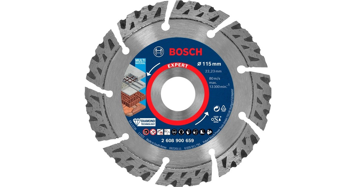 Die Ø 115mm Diamanttrennscheibe Expert MultiMaterial 2608900659 von Bosch ermöglicht zuverlässiges Schneiden in hartes Baumaterial, sogar in armierten Stahlbeton. Sie ist das perfekte Zubehör für vielbeschäftigte Bauprofis, die Beton, Ziegel, Dachziegel, Mauerwerk und Stahlbeton schneiden müssen, denn sie bietet eine 4-mal längere Lebensdauer als eine Standard Scheibe. Die Mischung aus optimaler Diamantkörnung und fortschrittlichem Design sorgt für eine unübertroffene Langlebigkeit der Expert MultiMaterial Trennscheibe. Die reibungsreduzierten Seitenflächen an den Segmenten dienen der Minimierung von Verschleiß an den Seiten. Die lasergeschweißten Segmente bieten die stärkste Verbindung mit dem Stahl-Stammblatt. Die Bosch Expert MultiMaterial schneidet zuverlässiger und länger und bietet dadurch ein hervorragendes Preis-Leistungs-Verhältnis. Mit 22,23mm Bohrungsdurchmesser eignet sie sich für kleine Standard Winkelschleifer mit Spannmutter.Art.-Nr.: 1776637