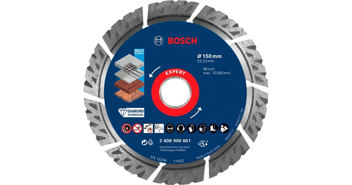 Die Ø 150mm Diamanttrennscheibe Expert MultiMaterial 2608900661 von Bosch ermöglicht zuverlässiges Schneiden in hartes Baumaterial, sogar in armierten Stahlbeton. Sie ist das perfekte Zubehör für vielbeschäftigte Bauprofis, die Beton, Ziegel, Dachziegel, Mauerwerk und Stahlbeton schneiden müssen, denn sie bietet eine 4-mal längere Lebensdauer als eine Standard Scheibe. Die Mischung aus optimaler Diamantkörnung und fortschrittlichem Design sorgt für eine unübertroffene Langlebigkeit der Expert MultiMaterial Trennscheibe. Die reibungsreduzierten Seitenflächen an den Segmenten dienen der Minimierung von Verschleiß an den Seiten. Die lasergeschweißten Segmente bieten die stärkste Verbindung mit dem Stahl-Stammblatt. Die Bosch Expert MultiMaterial schneidet zuverlässiger und länger und bietet dadurch ein hervorragendes Preis-Leistungs-Verhältnis. Mit 22,23mm Bohrungsdurchmesser eignet sie sich für Standard Winkelschleifer mit Spannmutter.Art.-Nr.: 1776639