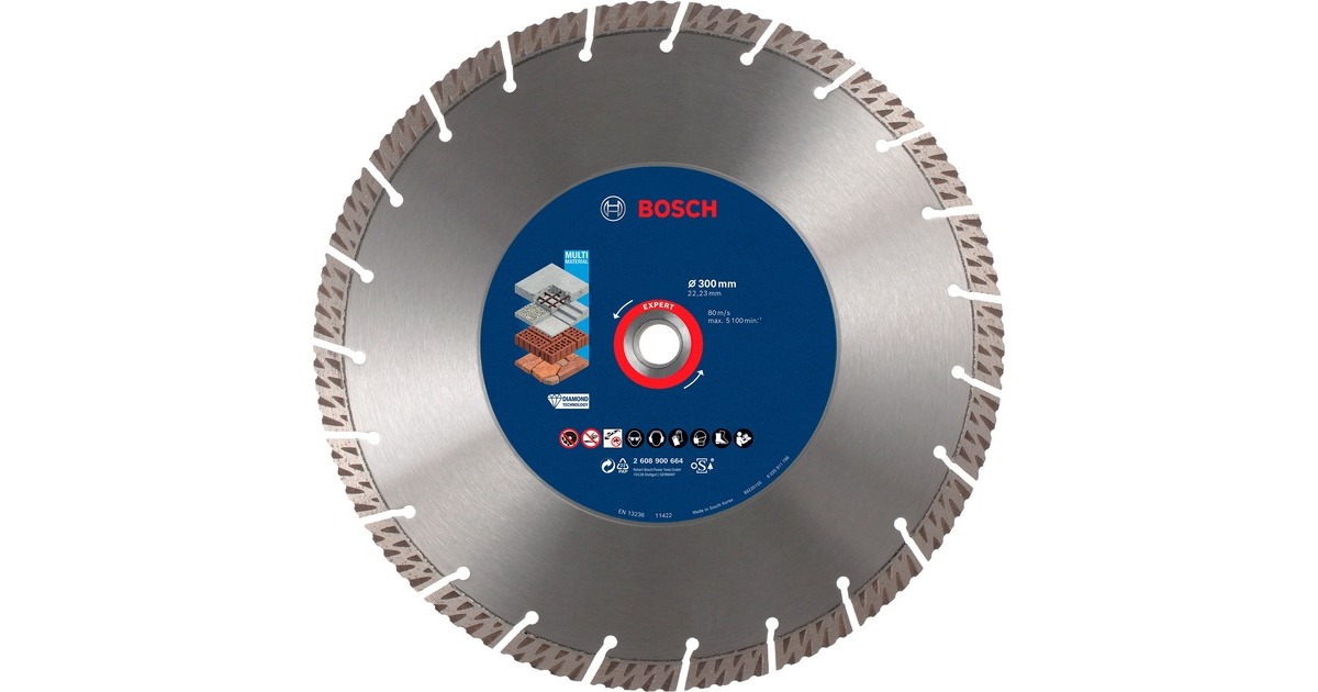 Die Ø 300mm Diamanttrennscheibe Expert MultiMaterial 2608900664 von Bosch ermöglicht zuverlässiges Schneiden in hartes Baumaterial, sogar in armierten Stahlbeton. Sie ist das perfekte Zubehör für vielbeschäftigte Bauprofis, die Beton, Ziegel, Dachziegel, Mauerwerk und Stahlbeton schneiden müssen, denn sie bietet eine 4-mal längere Lebensdauer als eine Standard Scheibe. Die Mischung aus optimaler Diamantkörnung und fortschrittlichem Design sorgt für eine unübertroffene Langlebigkeit der Expert MultiMaterial Trennscheibe. Die reibungsreduzierten Seitenflächen an den Segmenten dienen der Minimierung von Verschleiß an den Seiten. Die lasergeschweißten Segmente bieten die stärkste Verbindung mit dem Stahl-Stammblatt. Die Bosch Expert MultiMaterial schneidet zuverlässiger und länger und bietet dadurch ein hervorragendes Preis-Leistungs-Verhältnis. Mit 22,23mm Bohrungsdurchmesser eignet sie sich für große Standard Winkelschleifer mit Spannmutter.Art.-Nr.: 1776642