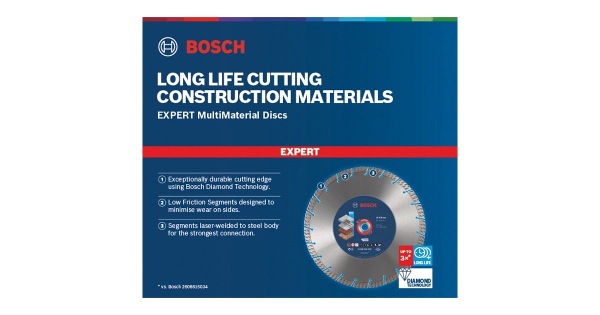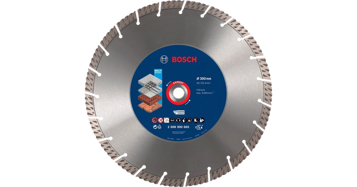 Die Ø 300mm Diamanttrennscheibe Expert MultiMaterial 2608900665 von Bosch ermöglicht zuverlässiges Schneiden in hartes Baumaterial, sogar in armierten Stahlbeton. Sie ist das perfekte Zubehör für vielbeschäftigte Bauprofis, die Beton, Ziegel, Dachziegel, Mauerwerk und Stahlbeton schneiden müssen, denn sie bietet eine 4-mal längere Lebensdauer als eine Standard Scheibe. Die Mischung aus optimaler Diamantkörnung und fortschrittlichem Design sorgt für eine unübertroffene Langlebigkeit der Expert MultiMaterial Trennscheibe. Die reibungsreduzierten Seitenflächen an den Segmenten dienen der Minimierung von Verschleiß an den Seiten. Die lasergeschweißten Segmente bieten die stärkste Verbindung mit dem Stahl-Stammblatt. Die Bosch Expert MultiMaterial schneidet zuverlässiger und länger und bietet dadurch ein hervorragendes Preis-Leistungs-Verhältnis. Mit 25,4mm Bohrungsdurchmesser eignet sie sich für Tischsägen, Benzinsägen oder große Trennmaschinen.Art.-Nr.: 1776643