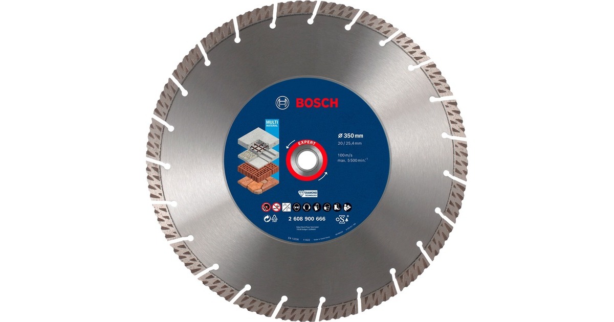 Die Ø 350mm Diamanttrennscheibe Expert MultiMaterial 2608900666 von Bosch ermöglicht zuverlässiges Schneiden in hartes Baumaterial, sogar in armierten Stahlbeton. Sie ist das perfekte Zubehör für vielbeschäftigte Bauprofis, die Beton, Ziegel, Dachziegel, Mauerwerk und Stahlbeton schneiden müssen, denn sie bietet eine 4-mal längere Lebensdauer als eine Standard Scheibe. Die Mischung aus optimaler Diamantkörnung und fortschrittlichem Design sorgt für eine unübertroffene Langlebigkeit der Expert MultiMaterial Trennscheibe. Die reibungsreduzierten Seitenflächen an den Segmenten dienen der Minimierung von Verschleiß an den Seiten. Die lasergeschweißten Segmente bieten die stärkste Verbindung mit dem Stahl-Stammblatt. Die Bosch Expert MultiMaterial schneidet zuverlässiger und länger und bietet dadurch ein hervorragendes Preis-Leistungs-Verhältnis. Mit 25,4mm Bohrungsdurchmesser eignet sie sich für Tischsägen, Benzinsägen oder große Trennmaschinen.Art.-Nr.: 1776644