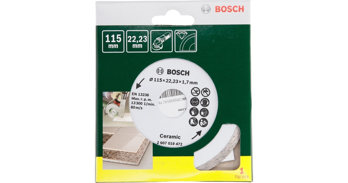 Die Bosch Diamanttrennscheibe Ø 115mm für Fliesen eignet sich sehr gut zur Bearbeitung von Materialien wie Keramikfliesen, Feinsteinzeug, Marmor oder Granit. Sie ist mit einem umlaufendem Schneiderand mit einer Schnittbreite von ca. 1,7mm ausgestattet. Die Bosch Diamanttrennscheibe wird für hohe Lebensdauer und maximale Sicherheit nach höchsten internationalen Qualitätsstandards gefertigt. Sie eignet sich für Standard Winkelschleifer mit Scheiben-Ø 115mm / 110mm aller Elektrowerkzeugmarken.Art.-Nr.: 1023164