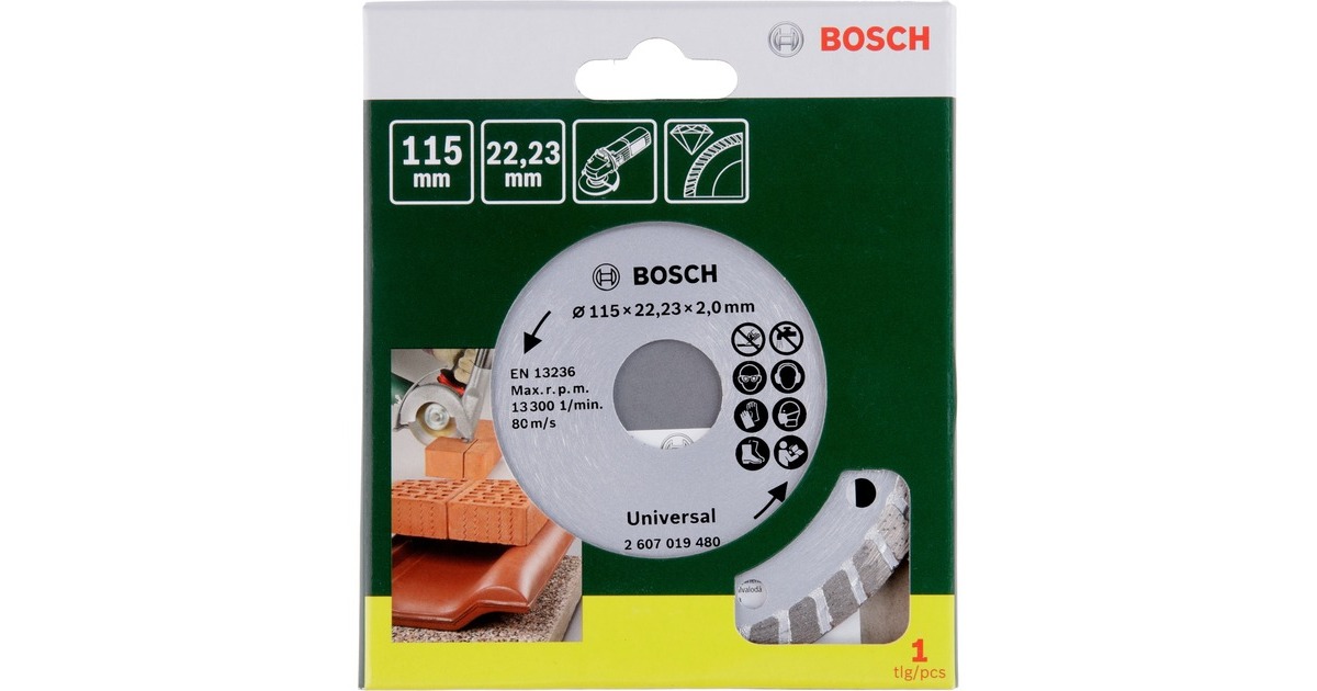 Die Ø 115mm Diamanttrennscheibe Turbo 2607019480 von Bosch eignet sich zum Schneiden von Baumaterialien wie z.B. Backstein, Ziegelstein, Beton, Granit und Naturstein. Mit 22,23mm Bohrungsdurchmesser eignet sie sich für kleinere Standard Winkelschleifer mit Spannmutter aller Werkzeugmarken. Für hohe Lebensdauer und maximale Sicherheit wird sie nach höchsten internationalen Qualitätsstandards gefertigt.Art.-Nr.: 1023203
