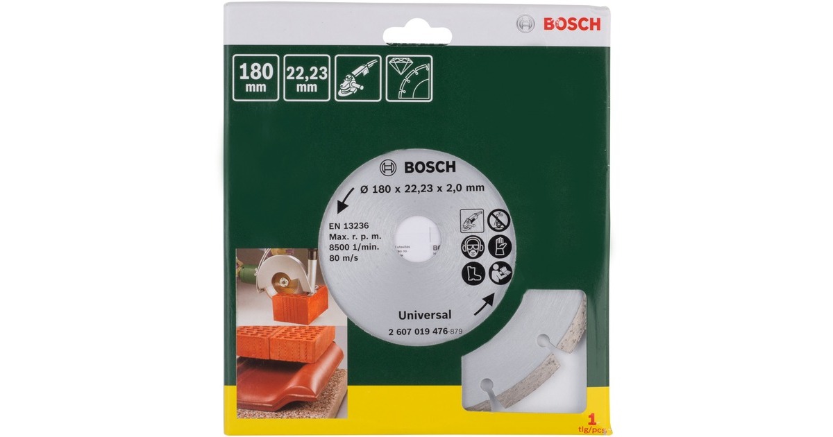 Die Ø 180mm Diamanttrennscheibe Universal 2607019476 von Bosch eignet sich zum Schneiden von Baumaterialien wie z.B. Backstein, Ziegelstein, Beton, Granit und Naturstein. Mit 22,23mm Bohrungsdurchmesser eignet sie sich für Standard Winkelschleifer mit Spannmutter aller Werkzeugmarken. Für hohe Lebensdauer und maximale Sicherheit wird sie nach höchsten internationalen Qualitätsstandards gefertigt.Art.-Nr.: 1023168