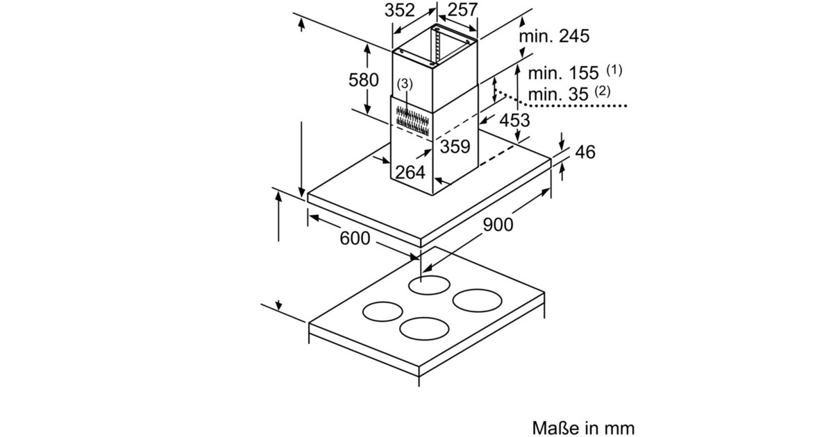 Gerätemaße Abluft (HxBxT): 744-924 x 898 x 600 mm | Gerätemaße Umluft (HxBxT): 744-1044 x 898 x 600 mm | Gerätemaße Umluft mit CleanAir Umluftmodul (HxBxT): 812-1044 x 898 x 600 mm |