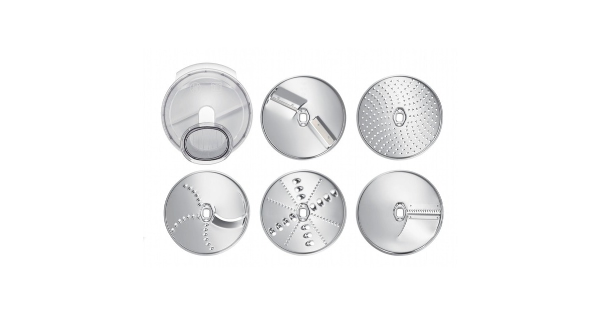 Schneid-Wendescheibe(dick und dünn), Raspel- Wendescheibe (grob und fein) und Reibscheibe mittelfein, Asia-Gemüse-Scheibe, Kartoffelpuffer-Rösti-Scheibe |