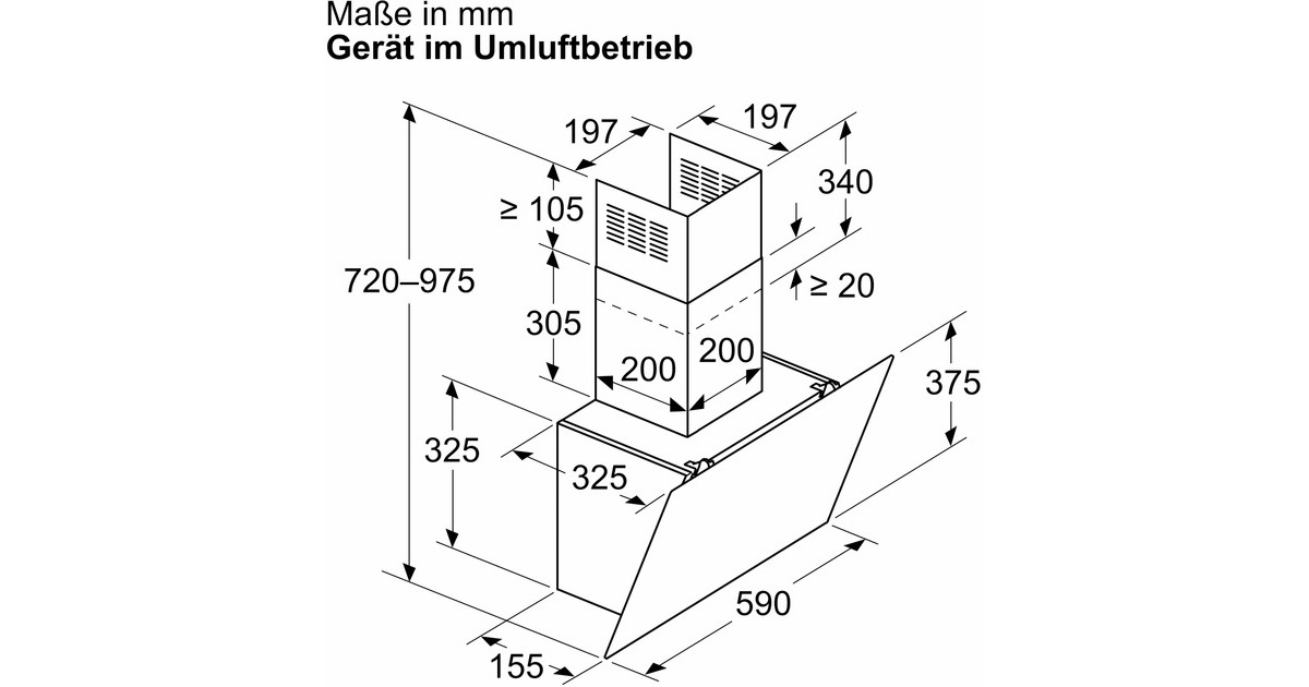 Gerätemaße Abluft (HxBxT): 690-900 x 590 x 325 mm | Gerätemaße Umluft (HxBxT): 720-975 x 590 x 325 mm |
