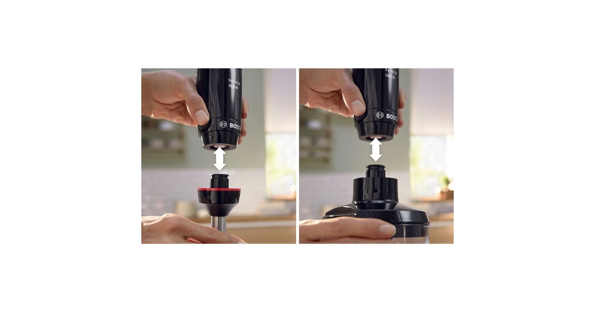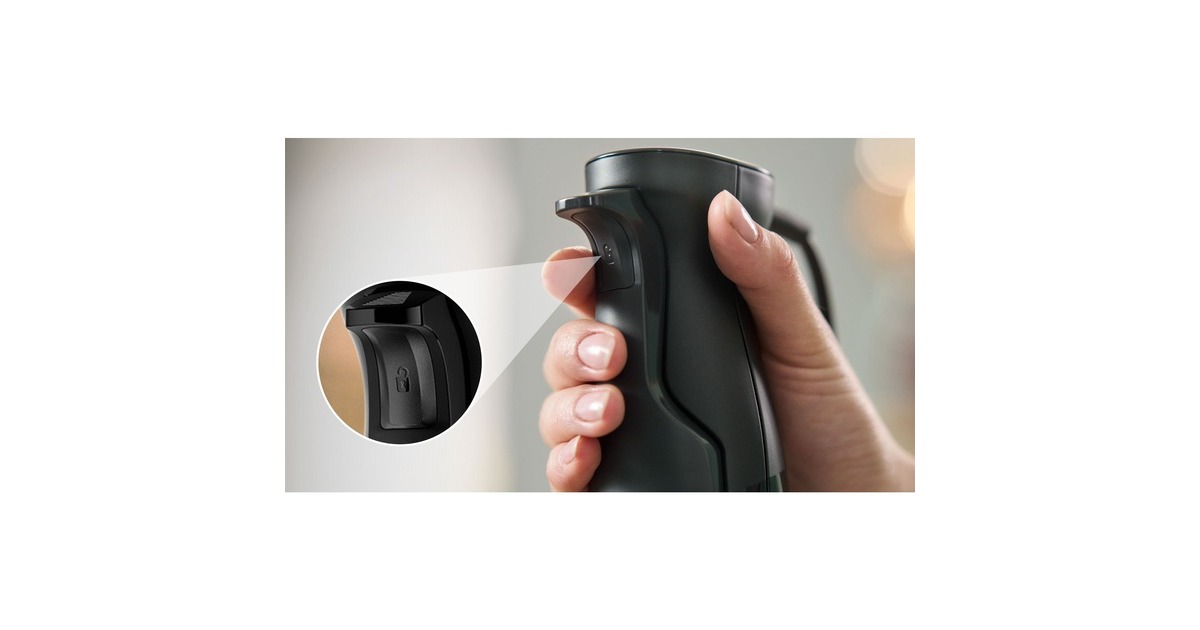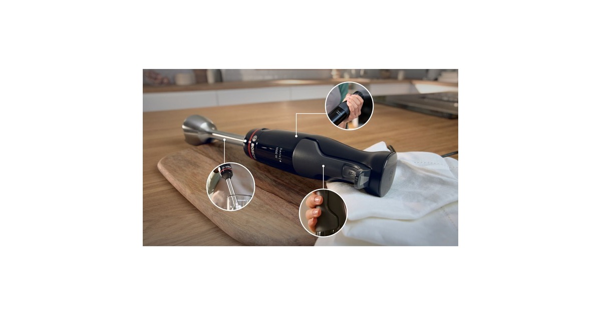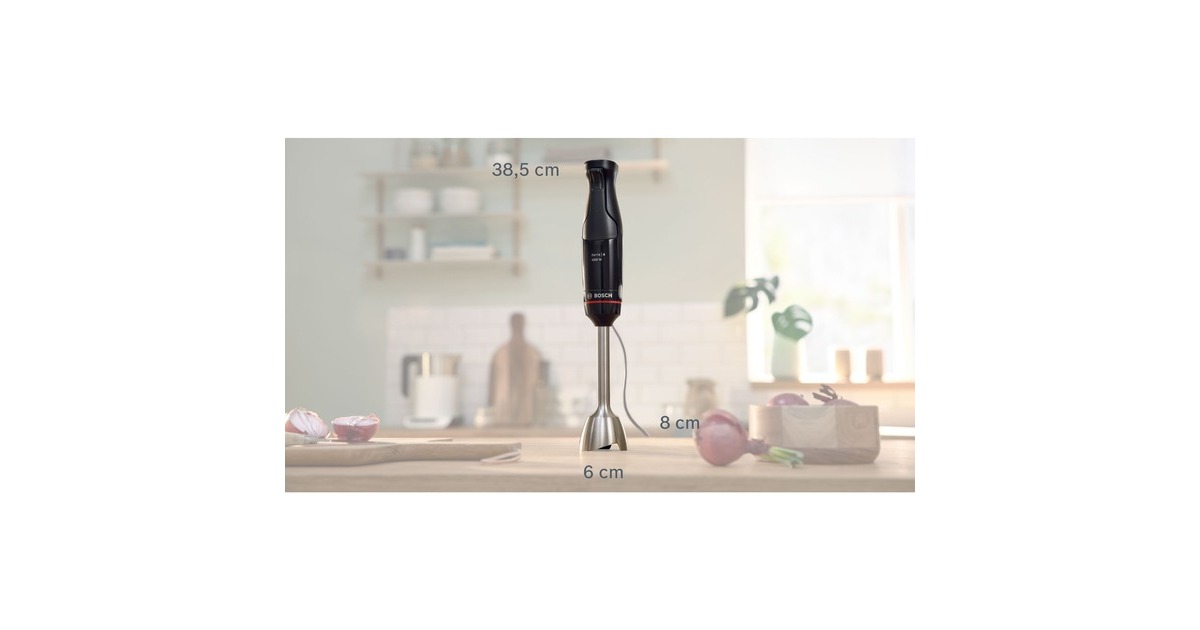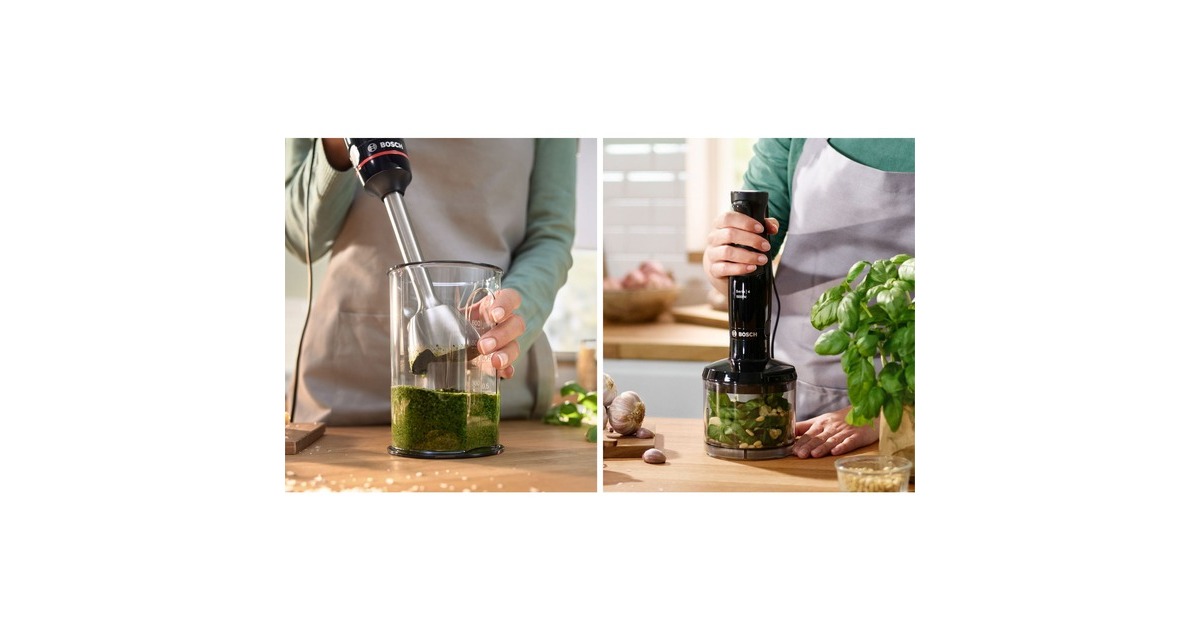 Das Stabmixer ErgoMaster MSM4B620 bietet eine ideale Kombination aus Kraft und Kontrolle. Der Stabmixer ist mit einer langlebigen Kupplung aus Keramik ausgestattet, so wird die Kraft an das Messer ohne Abriebeffekt übertragen. Der 1000-Watt-Motor bietet starke Leistung, auch für die härtesten Herausforderungen. Der ErgoMaster mit dynamischer Geschwindigkeitskontrolle lässt sich intuitiv und einhändig, durch Druck auf den Bedienhebel, steuern. Der ergonomische Griff mit Anti-Rutschbeschichtung und SoftTouch-Effekt macht die Bedienung noch komfortabler. So zerkleinert, mixt und verrührt der ErgoMaster Lebensmittel im Handumdrehen. Der Mixfuß mit dem Bosch QuattroBlade System mit vier extra-scharfen Edelstahl-Klingen sorgt für optimale Vermischung der Zutaten und perfekte Mixergebnisse hervorragende Schnittergebnisse, cremige Konsistenz und müheloses Zerkleinern, auch von harten Zutaten. Durch die spezielle Form der Glocke des Mixfußes werden Spritzer minimiert. Mit dem Universalzerkleinerer (500 ml Nutzvolumen) lassen sich Kräuter, Nüsse, Hartkäse, Schinken und vieles mehr zerkleinern. Dank spülmaschinenfester Teile ist die Reinigung einfach und bequem.