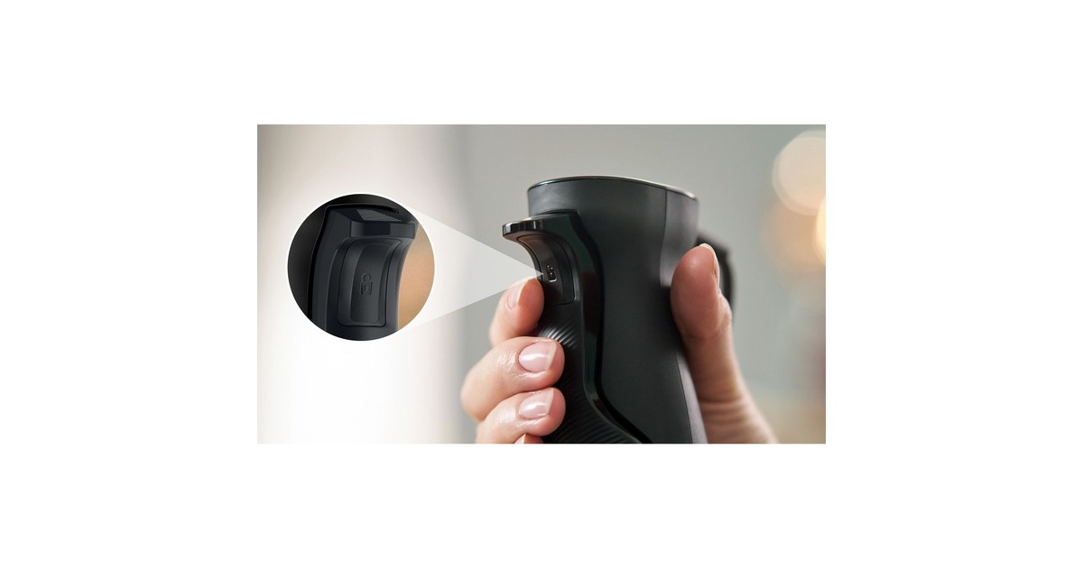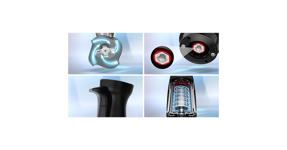 Dynamische Geschwindigkeitskontrolle für intuitive Anpassung durch Druck auf den Griff. Einfaches Tauschen der Zubehöre durch einen KlickMechanismus. |