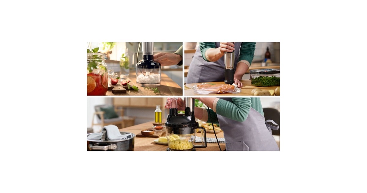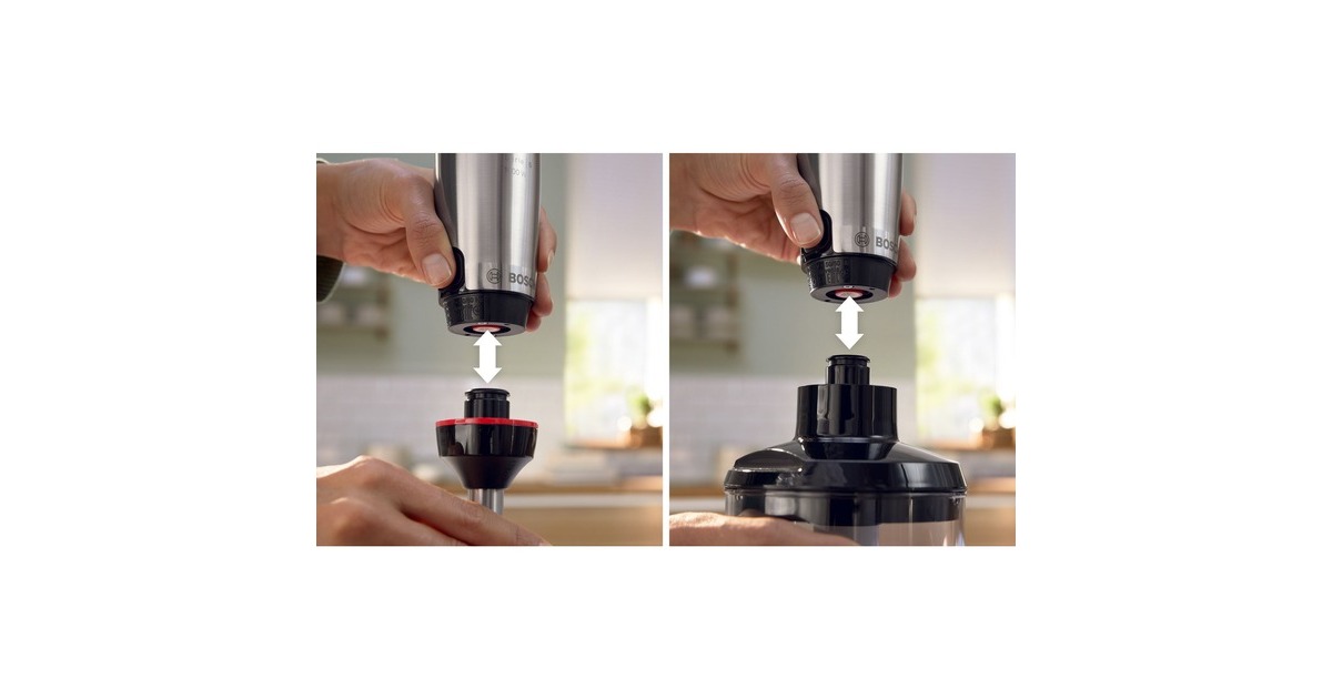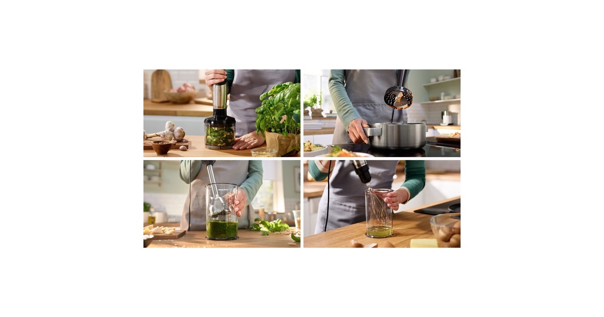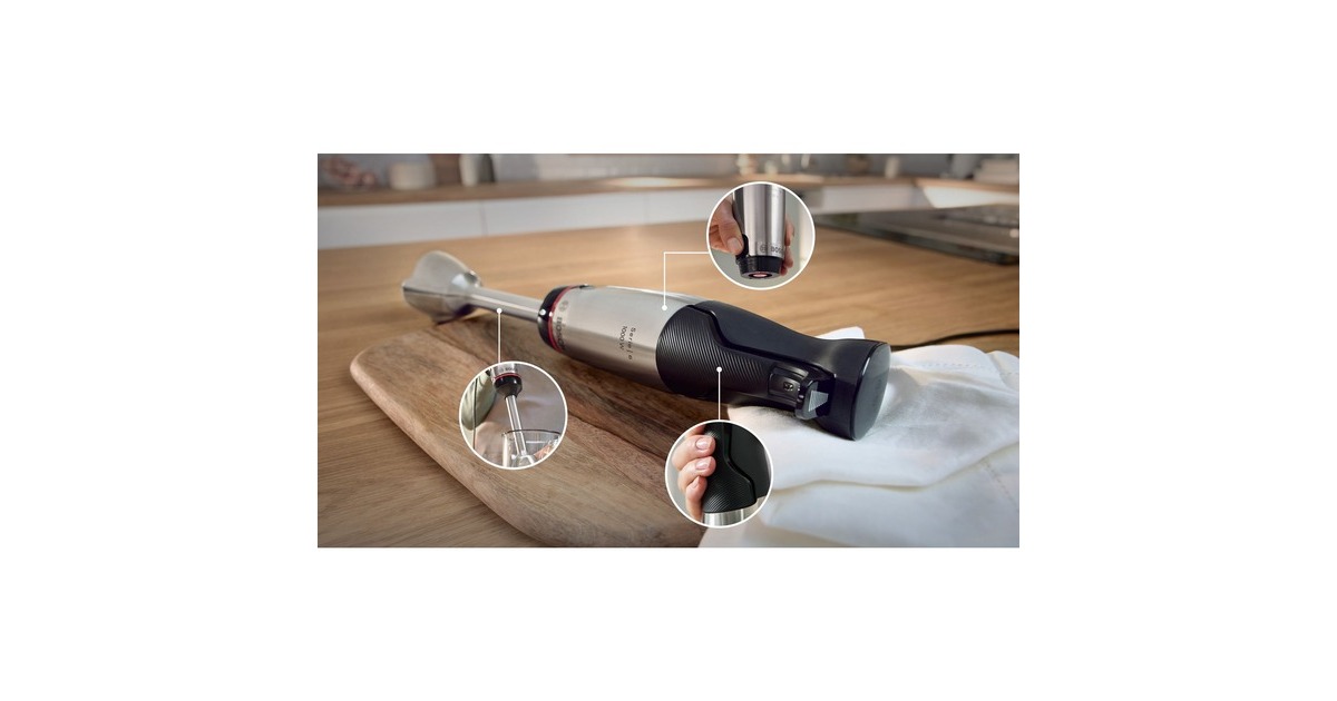 Das Stabmixer ErgoMaster MSM6M623 bietet eine ideale Kombination aus Kraft und Kontrolle. Der Stabmixer ist mit einer langlebigen Kupplung aus Keramik ausgestattet, so wird die Kraft an das Messer ohne Abriebeffekt übertragen. Der 1000-Watt-Motor bietet starke Leistung, auch für die härtesten Herausforderungen. Der ErgoMaster mit dynamischer Geschwindigkeitskontrolle lässt sich intuitiv und einhändig, durch Druck auf den Bedienhebel, steuern. Der ergonomische Griff mit Anti-Rutschbeschichtung und SoftTouch-Effekt macht die Bedienung noch komfortabler. So zerkleinert, mixt und verrührt der ErgoMaster Lebensmittel im Handumdrehen. Der Mixfuß ist mit dem Bosch QuattroBlade Pro System mit AntiSplash Funktion und Flow Booster Linien für optimale Vermischung der Zutaten und perfekte Mixergebnisse ausgestattet. So lässt sich effizient Mixen ohne Unterbrechungen oder Spritzer. Für weitere Einsatzmöglichkeiten sorgt das umfangreiche Zubehör. Mit dem Universalzerkleinerer (500 ml Nutzvolumen) lassen sich Kräuter, Nüsse, Hartkäse, Schinken und vieles mehr zerkleinern. Der Edelstahl Schneebesen sorgt für luftigen Eischnee und Schlagsahne und der Kartoffelstampfer für cremiges Püree aus gekochten Kartoffeln, Erbsen oder Früchten. Dank spülmaschinenfester Teile ist die Reinigung einfach und bequem.