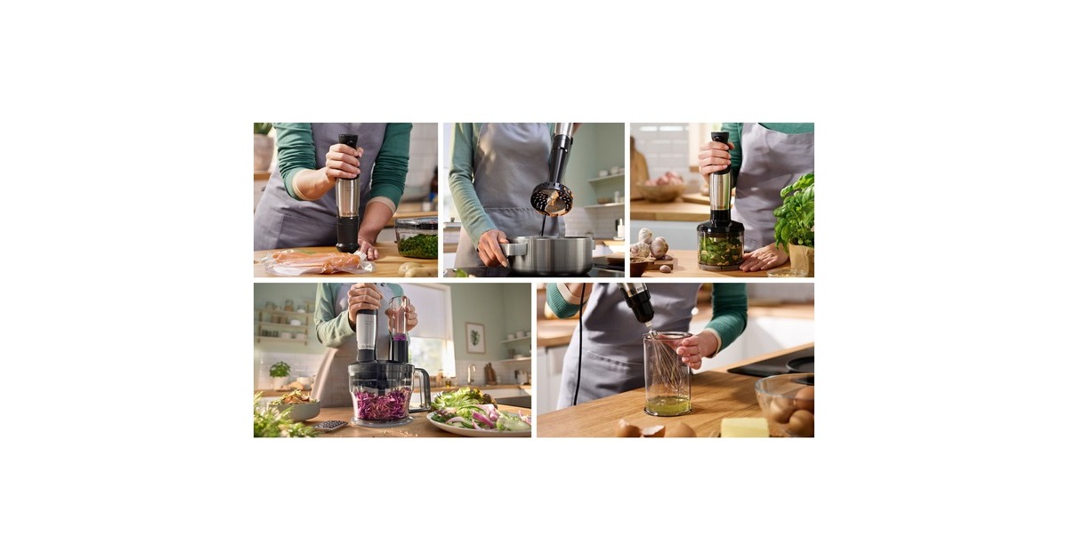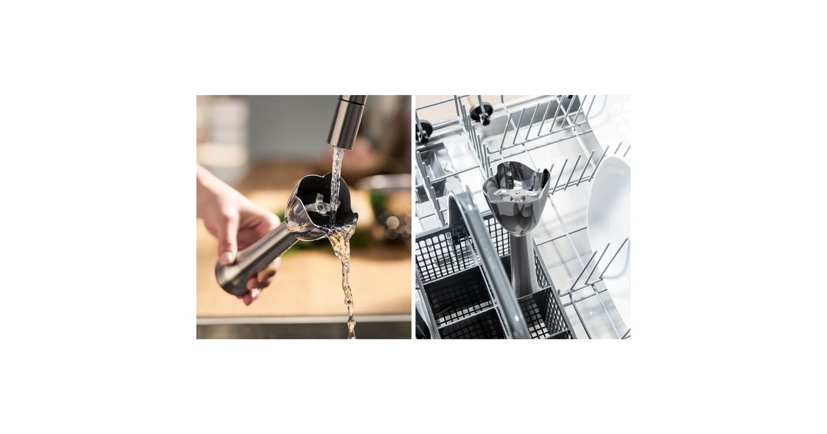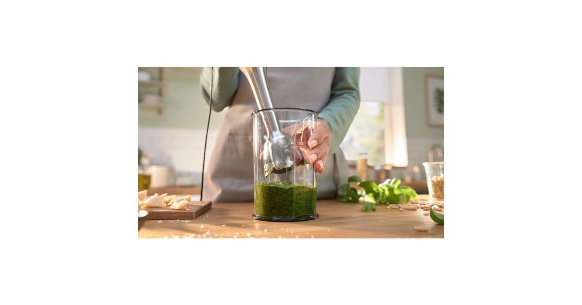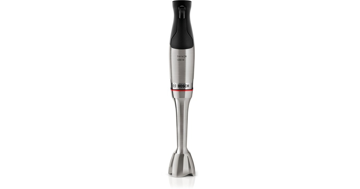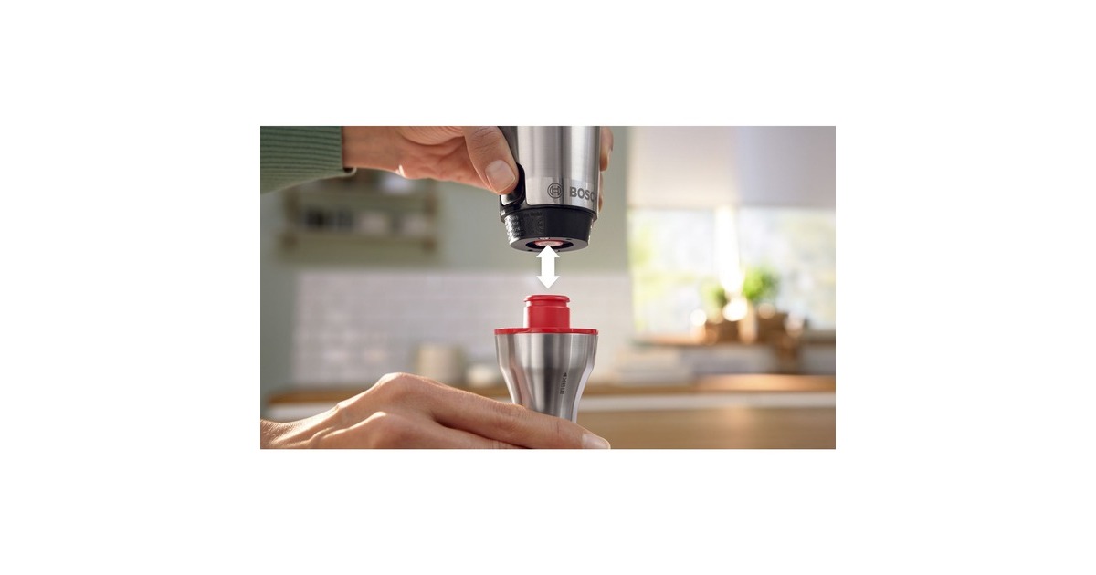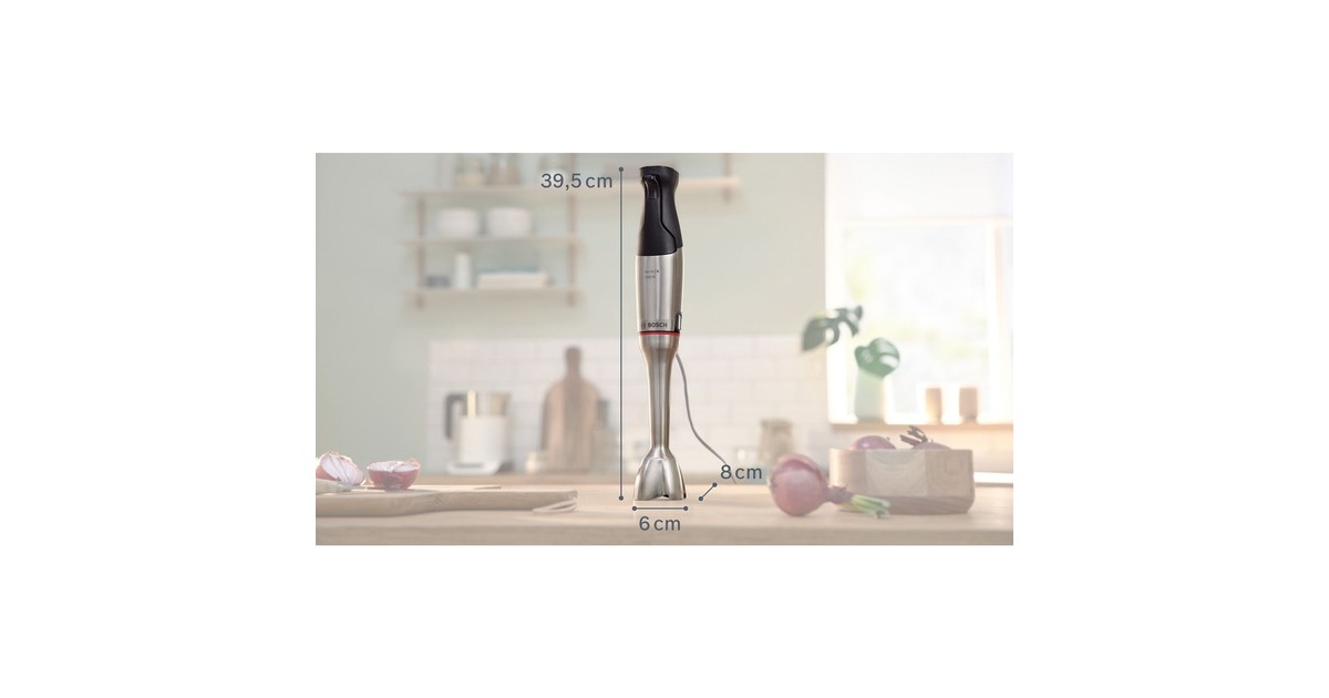 Das Stabmixer ErgoMaster MSM6M810 bietet eine ideale Kombination aus Kraft und Kontrolle. Der erste Stabmixer mit einer langlebigen Kupplung aus Keramik, so wird die Kraft an das Messer ohne Abriebeffekt übertragen. Der 1200-Watt-Motor bietet starke Leistung, auch für die härtesten Herausforderungen. Der ErgoMaster mit dynamischer Geschwindigkeitskontrolle lässt sich intuitiv, durch Druck auf den Bedienhebel, steuern. Je fester der Griff um den Bedienhebel, desto schneller die Geschwindigkeit beim Stabmixer. Der extra-große Hebel ist perfekt für eine einhändige Bedienung. Somit ist das Gerät sowohl für Rechts- als auch für Linkshänder geeignet. Die Einschaltsperre stellt sicher, dass der ErgoMaster nur läuft, wenn man ihn sicher in der Hand hält. So zerkleinert, mixt und verrührt der ErgoMaster Lebensmittel im Handumdrehen. Der Mixfuß ist mit dem Bosch dem QuattroBlade System Pro mit AntiSplash-Funktion ausgestattet. Das spezielle Design der Mixglocke mit den Flow Booster Linien stellt sicher, dass die Zutaten optimal verwirbelt und damit perfekt gemixt werden. Zudem verringern die Linien, dass sich die Mixglocke beim Mixen am Boden festsaugt. So kann kontrolliert gemixt werden: ohne Unterbrechungen und ohne Kleckern. Im Zusammenspiel mit den vier extra-scharfen Edelstahl Klingen, bekommt man die beste Bosch Leistung geboten: cremige Textur und müheloses Mixen, auch bei den härtesten Zutaten.