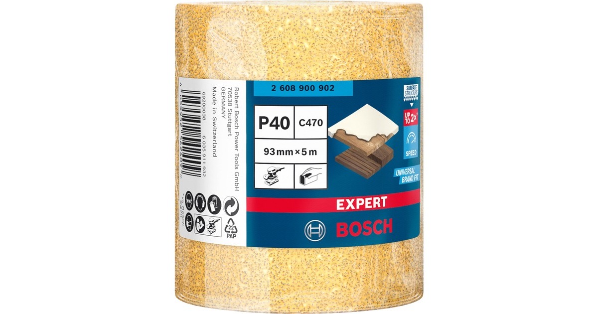 Das ungelochte Bosch Expert Schleifblatt C470 besitzt dank der Bosch Surface Structure eine überragende Materialabtragsrate beim Schleifen von Holz, Farbe, Lack, Rauputz und Füllstoffen. Viele Schleifpapiere setzen sich schnell mit Staub zu und verlieren ihre Abrasivität, wodurch das Schleifen viel mehr Zeit benötigt. Durch die Kombination von scharfen Körnern und spezieller Technologie, welche das Zusetzen verhindert, behält das Expert C470 Schleifpapier seine besonderen Fähigkeiten bei. Das bedeutet, man kann schneller und länger arbeiten, ohne dabei Kompromisse beim Schleifergebnis eingehen zu müssen. Das Schleifblatt C470 auf 5 Meter Rolle eignet sich zum Handschleifen mit Schleifklotz oder passend zugeschnitten für Schwingschleifer mit Klemmhebel und lässt sich einfach wechseln und fixieren.Art.-Nr.: 1777194