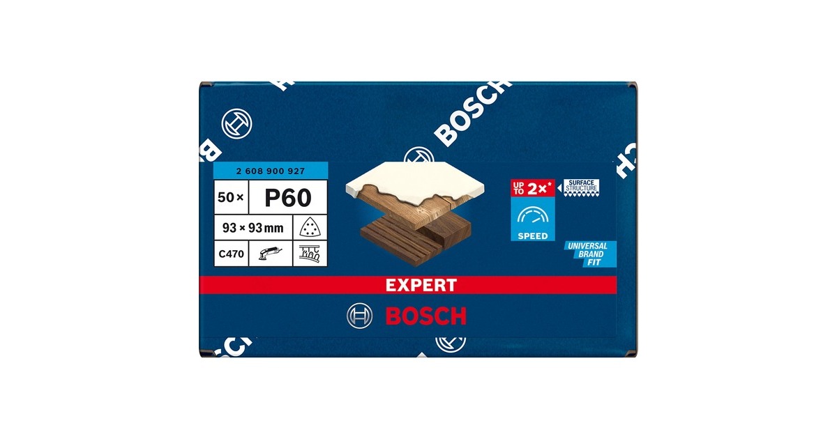 Die dreieckigen Bosch Expert Schleifblätter C470 besitzen dank der Bosch Surface Structure eine überragende Materialabtragsrate beim Schleifen von Holz, Farbe, Lack, Rauputz und Füllstoffen. Viele Schleifpapiere setzen sich schnell mit Staub zu und verlieren ihre Abrasivität, wodurch das Schleifen viel mehr Zeit benötigt. Durch die Kombination von scharfen Körnern und spezieller Technologie, welche das Zusetzen verhindert, behält das Expert C470 Schleifpapier seine besonderen Fähigkeiten bei. Das bedeutet, man kann schneller und länger arbeiten, ohne dabei Kompromisse beim Schleifergebnis eingehen zu müssen. Das Schleifblatt C470 im 50er-Vorratspack eignet sich für Deltaschleifer und Multifunktionswerkzeuge der meisten Marken und lässt sich dank des Klett-Befestigungssystems schnell und einfach wechseln und fixieren.Art.-Nr.: 1777240
