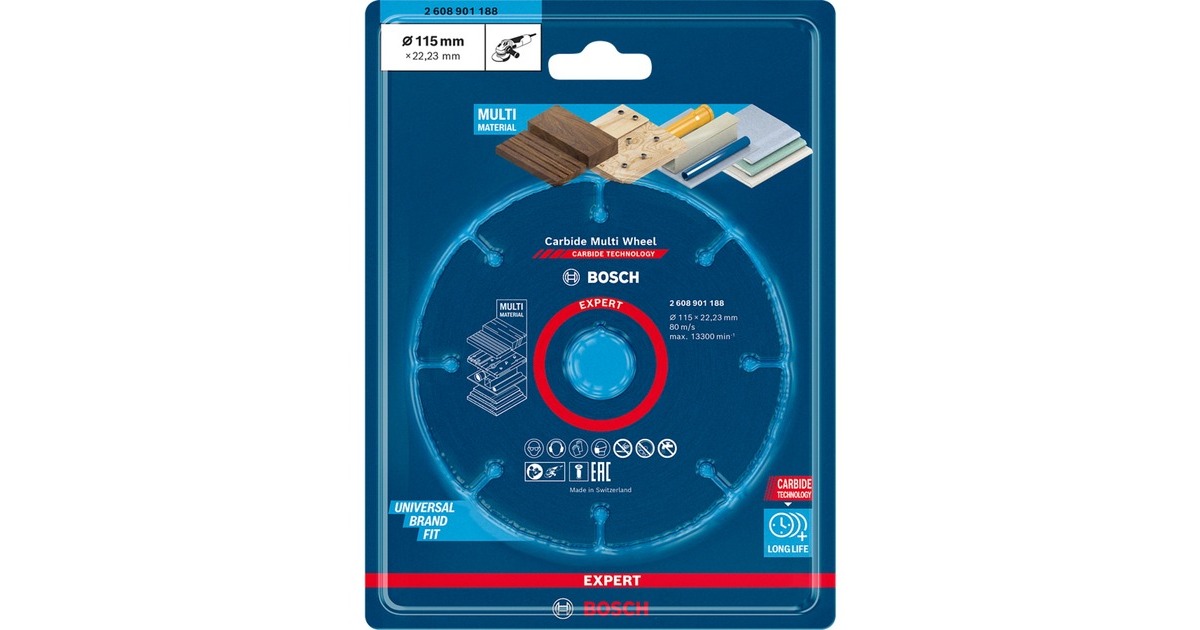 Die Ø 115mm EXPERT Carbide MultiWheel Trennscheibe 2608901188 von Bosch ermöglicht sicheres und einfaches Schneiden mit dem Winkelschleifer in fast jedes Material, z.B. Kunststoff, Metall, Hartholz, Bauholz mit Nägeln, Gipskartonplatten, Trockenbaumaterialien und moderne Verbundwerkstoffe. Die EXPERT Carbide MultiWheel Trennscheibe mit Longlife+ bietet eine herausragende Lebensdauer in den unterschiedlichsten Materialien dank der Bosch Carbide Technology. Der gleichbleibende Durchmesser hält die Schnittgeschwindigkeit und die Schnittkapazität konstant hoch. Mit 22,23mm Bohrungsdurchmesser eignet sie sich für kleine Standard Winkelschleifer mit Spannmutter.Art.-Nr.: 1777605