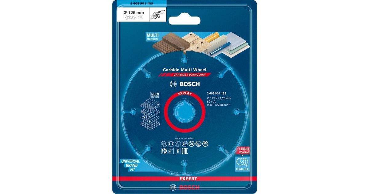 Die Ø 125mm EXPERT Carbide MultiWheel Trennscheibe 2608901189 von Bosch ermöglicht sicheres und einfaches Schneiden mit dem Winkelschleifer in fast jedes Material, z.B. Kunststoff, Metall, Hartholz, Bauholz mit Nägeln, Gipskartonplatten, Trockenbaumaterialien und moderne Verbundwerkstoffe. Die EXPERT Carbide MultiWheel Trennscheibe mit Longlife+ bietet eine herausragende Lebensdauer in den unterschiedlichsten Materialien dank der Bosch Carbide Technology. Der gleichbleibende Durchmesser hält die Schnittgeschwindigkeit und die Schnittkapazität konstant hoch. Mit 22,23mm Bohrungsdurchmesser eignet sie sich für Standard Winkelschleifer mit Spannmutter.Art.-Nr.: 1777606