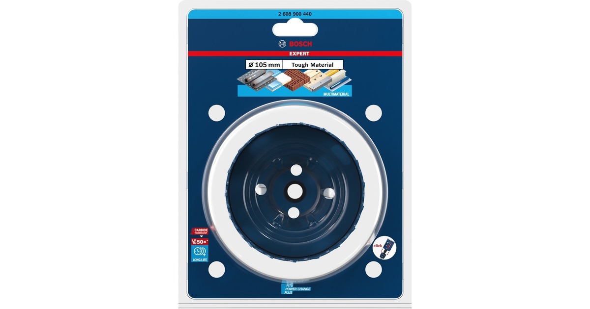 Die Expert Lochsäge 'ToughMaterial', Ø 105mm von Bosch bietet dank der individuell geschliffenen Zähne aus feinem, hartem Carbide eine exzellente Festigkeit und Stabilität für eine maximale Lebensdauer. Viele Lochsägen, die angeblich für mehrere Materialien geeignet sind, funktionieren gut in Holz und weichem Metall. Aber harte Schrauben oder Metallbeschläge haben die Renovierungsarbeiten oft zum Stillstand gebracht, Sägezähne zerstört und die Produktivität beeinträchtigt. Die Expert Lochsäge 'ToughMaterial' hat damit keine Probleme. Es durchtrennt mit seinen Carbide-Zähnen Holz mit gehärteten Nägeln oder Schrauben, Bauholz mit Mörtelresten und Stahlteilen, Ziegelsteine, weiche Fliesen, Edelstahlbleche und Kunststoffe. Das patentiertes Schlitzdesign sorgt dabei für bessere Sicht und einfacheres Auswerfen des Bohrkerns. Die Expert Lochsäge 'ToughMaterial', Ø 105mm eignet sich zur Verwendung mit dem Power Change Plus-Schnellspann-Adapter von Bosch (nicht im Lieferumfang enthalten).Art.-Nr.: 1767948