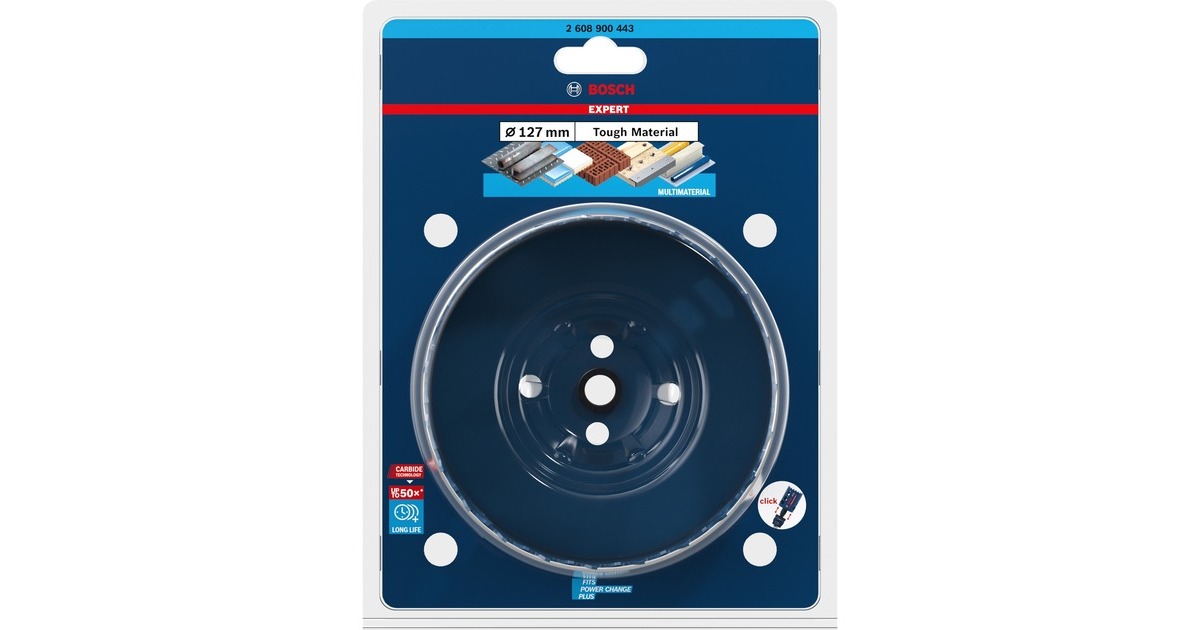 Die Expert Lochsäge 'ToughMaterial', Ø 127mm von Bosch bietet dank der individuell geschliffenen Zähne aus feinem, hartem Carbide eine exzellente Festigkeit und Stabilität für eine maximale Lebensdauer. Viele Lochsägen, die angeblich für mehrere Materialien geeignet sind, funktionieren gut in Holz und weichem Metall. Aber harte Schrauben oder Metallbeschläge haben die Renovierungsarbeiten oft zum Stillstand gebracht, Sägezähne zerstört und die Produktivität beeinträchtigt. Die Expert Lochsäge 'ToughMaterial' hat damit keine Probleme. Es durchtrennt mit seinen Carbide-Zähnen Holz mit gehärteten Nägeln oder Schrauben, Bauholz mit Mörtelresten und Stahlteilen, Ziegelsteine, weiche Fliesen, Edelstahlbleche und Kunststoffe. Das patentiertes Schlitzdesign sorgt dabei für bessere Sicht und einfacheres Auswerfen des Bohrkerns. Die Expert Lochsäge 'ToughMaterial', Ø 127mm eignet sich zur Verwendung mit dem Power Change Plus-Schnellspann-Adapter von Bosch (nicht im Lieferumfang enthalten).Art.-Nr.: 1767949