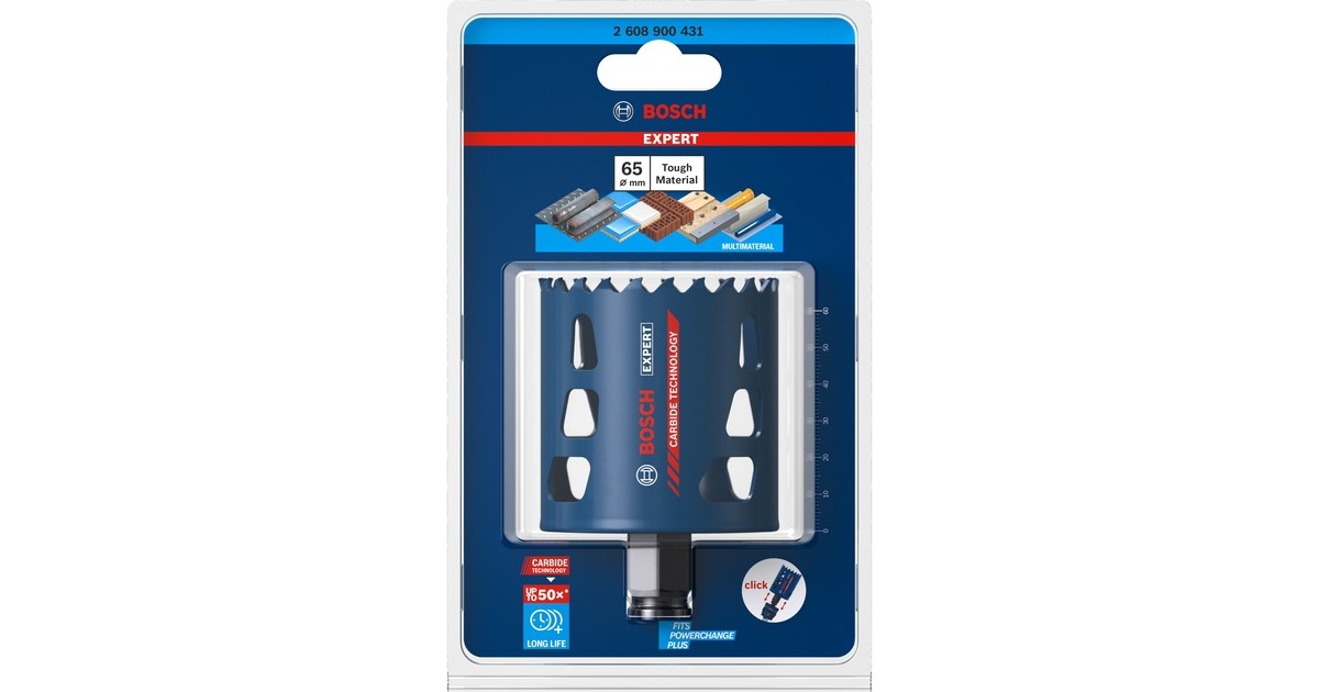 Die Expert Lochsäge 'ToughMaterial', Ø 65mm von Bosch bietet dank der individuell geschliffenen Zähne aus feinem, hartem Carbide eine exzellente Festigkeit und Stabilität für eine maximale Lebensdauer. Viele Lochsägen, die angeblich für mehrere Materialien geeignet sind, funktionieren gut in Holz und weichem Metall. Aber harte Schrauben oder Metallbeschläge haben die Renovierungsarbeiten oft zum Stillstand gebracht, Sägezähne zerstört und die Produktivität beeinträchtigt. Die Expert Lochsäge 'ToughMaterial' hat damit keine Probleme. Es durchtrennt mit seinen Carbide-Zähnen Holz mit gehärteten Nägeln oder Schrauben, Bauholz mit Mörtelresten und Stahlteilen, Ziegelsteine, weiche Fliesen, Edelstahlbleche und Kunststoffe. Das patentiertes Schlitzdesign sorgt dabei für bessere Sicht und einfacheres Auswerfen des Bohrkerns. Die Expert Lochsäge 'ToughMaterial', Ø 65mm eignet sich zur Verwendung mit dem Power Change Plus-Schnellspann-Adapter von Bosch (nicht im Lieferumfang enthalten).Art.-Nr.: 1767821