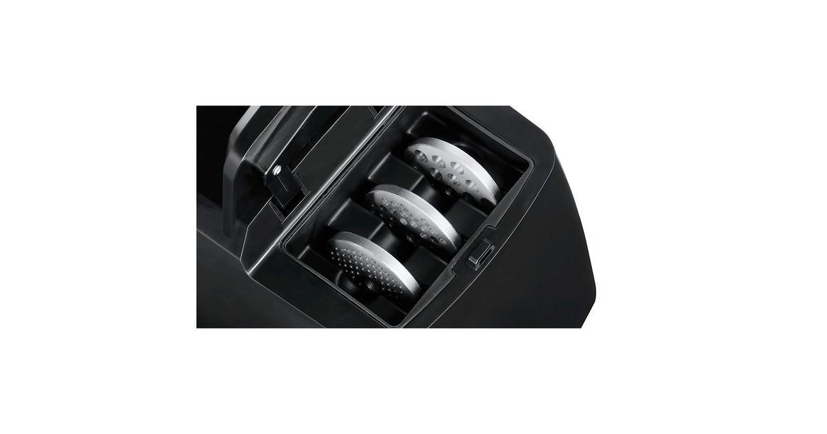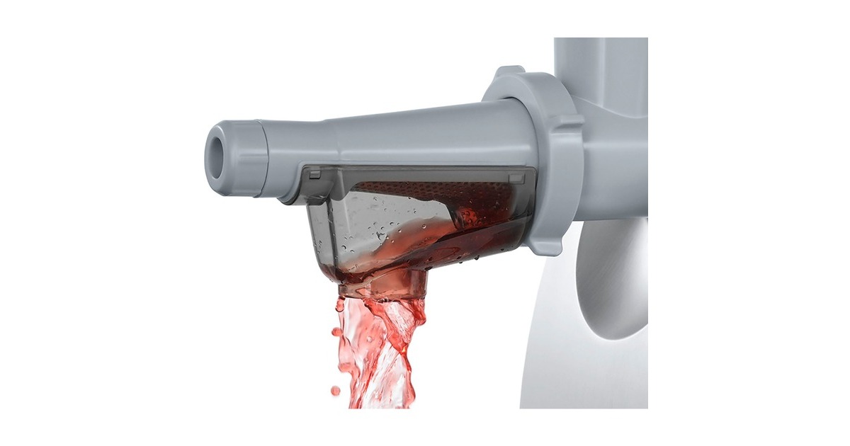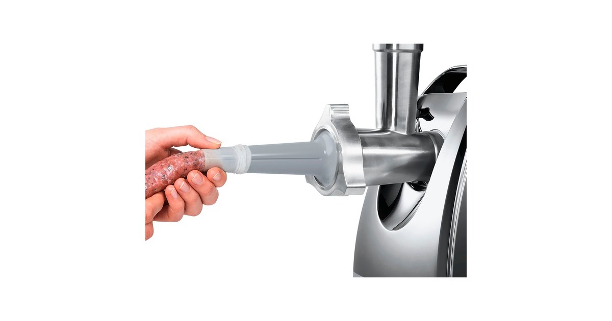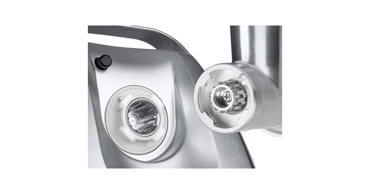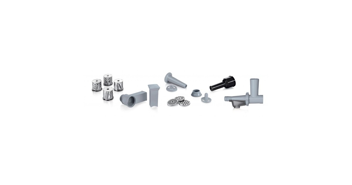 Einfüllhilfe, Einfüllschale, Fruchtpressenvorsatz, Reibevorsatz, Reibscheibe fein, Reibscheibe grob, Stopfer, Wurststopfervorsatz, Schneideinsatz dünn, Kebbevorsatz |
