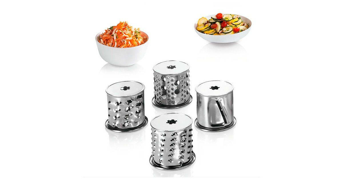 Fruchtpressenvorsatz, Reibevorsatz, Reibscheibe fein, Reibscheibe grob, Wurststopfervorsatz, Schneideinsatz dünn, Kebbevorsatz |