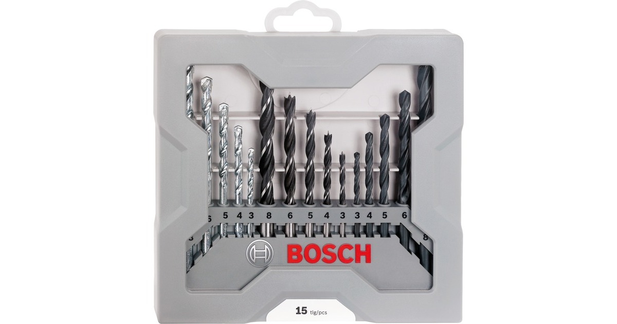 Das 15-teilige gemischte Bohrer-Set 2607017038 von Bosch besteht aus je fünf HSS-Metallbohrern, HM-Steinbohrern und CV-Holzbohrern, in den Größen von 3mm bis 8mm.Art.-Nr.: 1040001