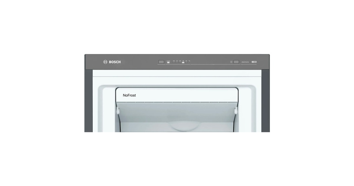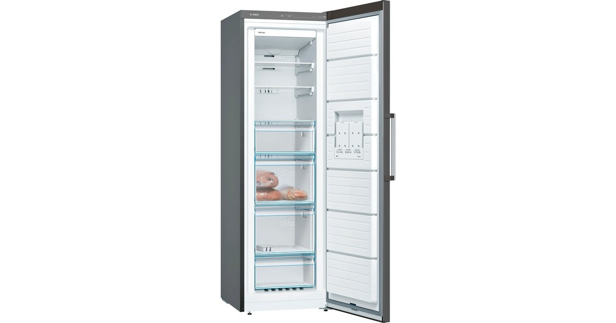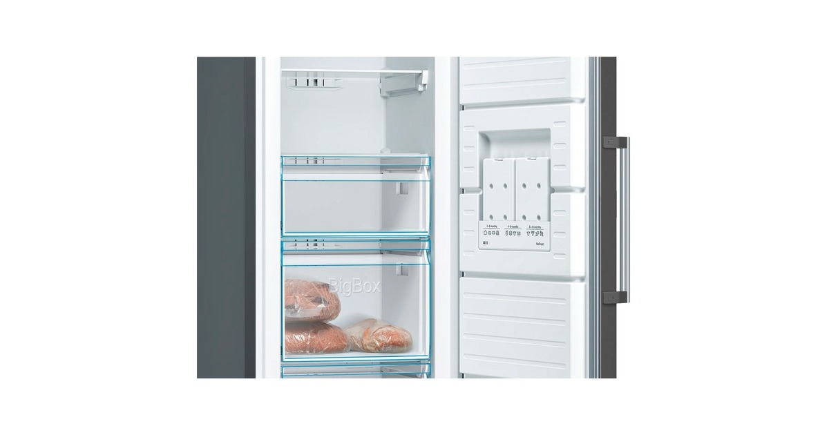 Der Gefrierschrank Bosch GSN36VXEP ist mit einem Gesamtnutzinhalt von 242 Litern ideal für den größeren Haushalt geeignet. Er stellt neben einer easyAccess Zone vier transparente Gefrierschubladen, davon zwei BigBoxen zum Stapeln von Einfrierbehältern oder für großes Gefriergut, zur Verfügung, die sich dank VarioZone einfach herausnehmen und flexibel auf die persönlichen Platzansprüche einstellen lassen. Mit der NoFrost-Technologie wird mühsames Abtauen überflüssig, FreshSense sorgt für eine konstante Temperatur durch intelligente Sensortechnik und die SuperGefrieren-Funktion schützt Tiefgefrorenes beim Einlegen frischer Lebensmittel vor dem Antauen. Die Temperaturregelung des GSN36VXEP erfolgt mittels TouchControl und ist digital ablesbar. Mit einem Stromverbrauch von 234 kWh im Jahr ist der GSN36VXEP in die Energieeffizienzklasse E eingestuft.Art.-Nr.: 100021443