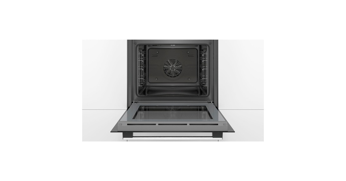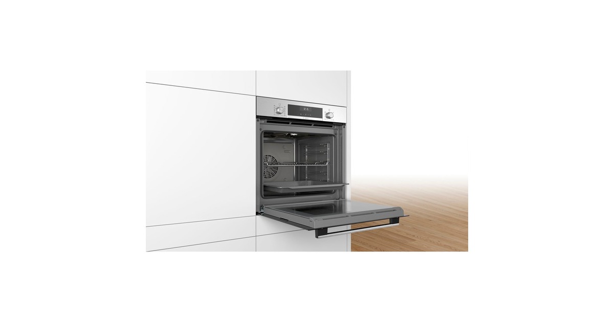 Der Einbau-Backofen Bosch HBA537BS0 in Edelstahl ist mit einem Nutzinhalt von 71 Litern optimal für jede Küche geeignet und lässt sich als Einbaugerät nahezu überall platzieren. Sieben Heizarten, wie die 3D Heißluft für perfekte Ergebnisse dank optimaler Wärmeverteilung auf bis zu drei Ebenen gleichzeitig, und zehn Automatikprogramme lassen sich bequem über versenkbare Bedienknebel und das LED-Display einstellen. Die energiesparende Reinigungshilfe EcoClean baut Spritzer dank einer spezielle Rückwand-Beschichtung aus mikrofeinen Keramikkügelchen bereits während des Backens und Bratens ab und die Granit-Emaillebeschichtung der Backofeninnenwände erleichtert die Reinigung und Pflege des Geräts ebenfalls. In puncto Sicherheit bleiben beim HBA537BS0 mit eingebauter Kindersicherung, Restwäremanezeige und Kühlgebläse keine Wünsche offen.Art.-Nr.: 1384365