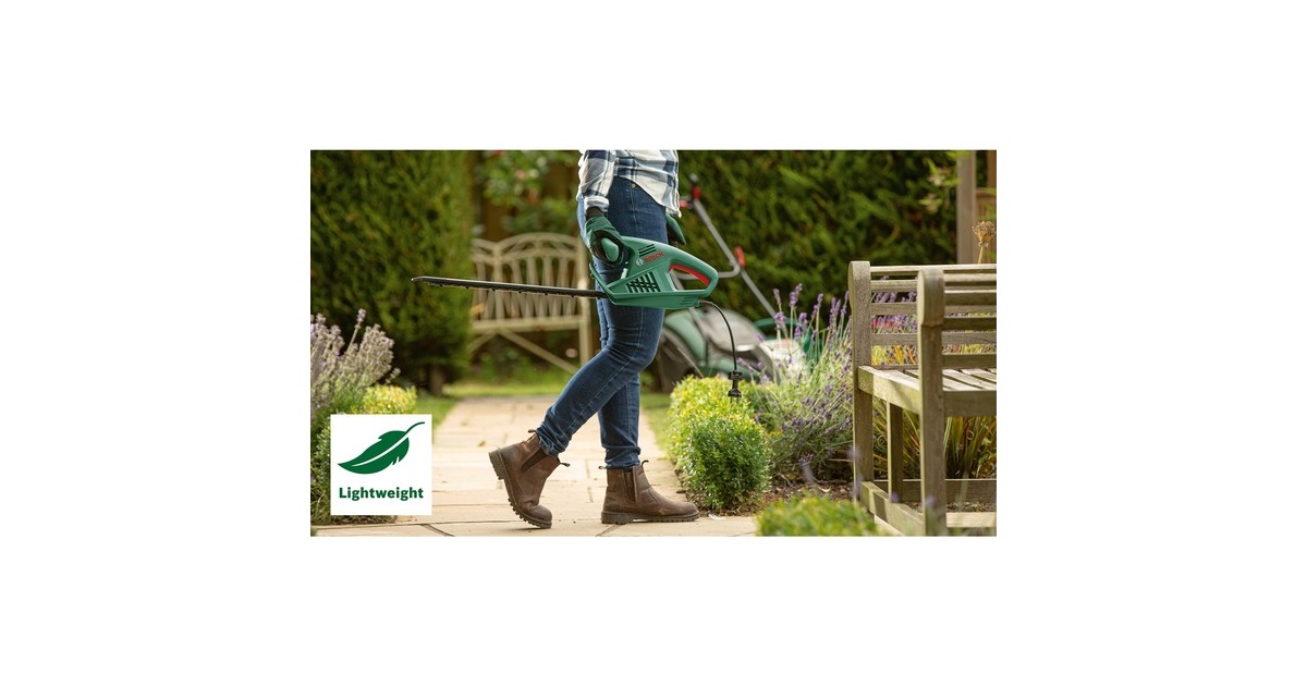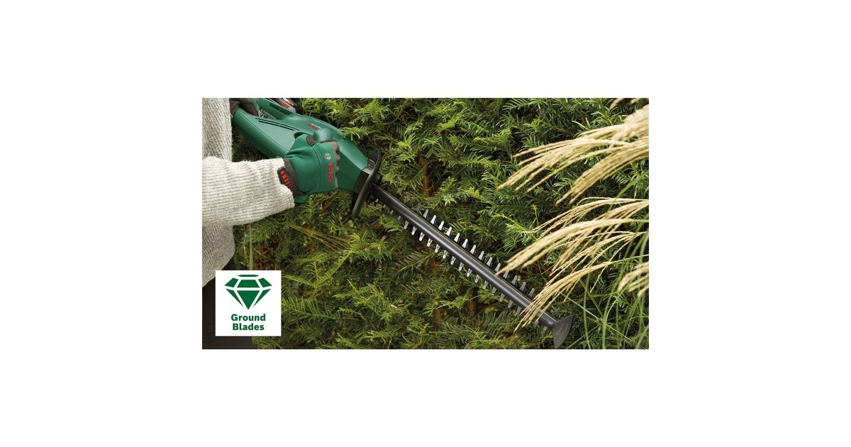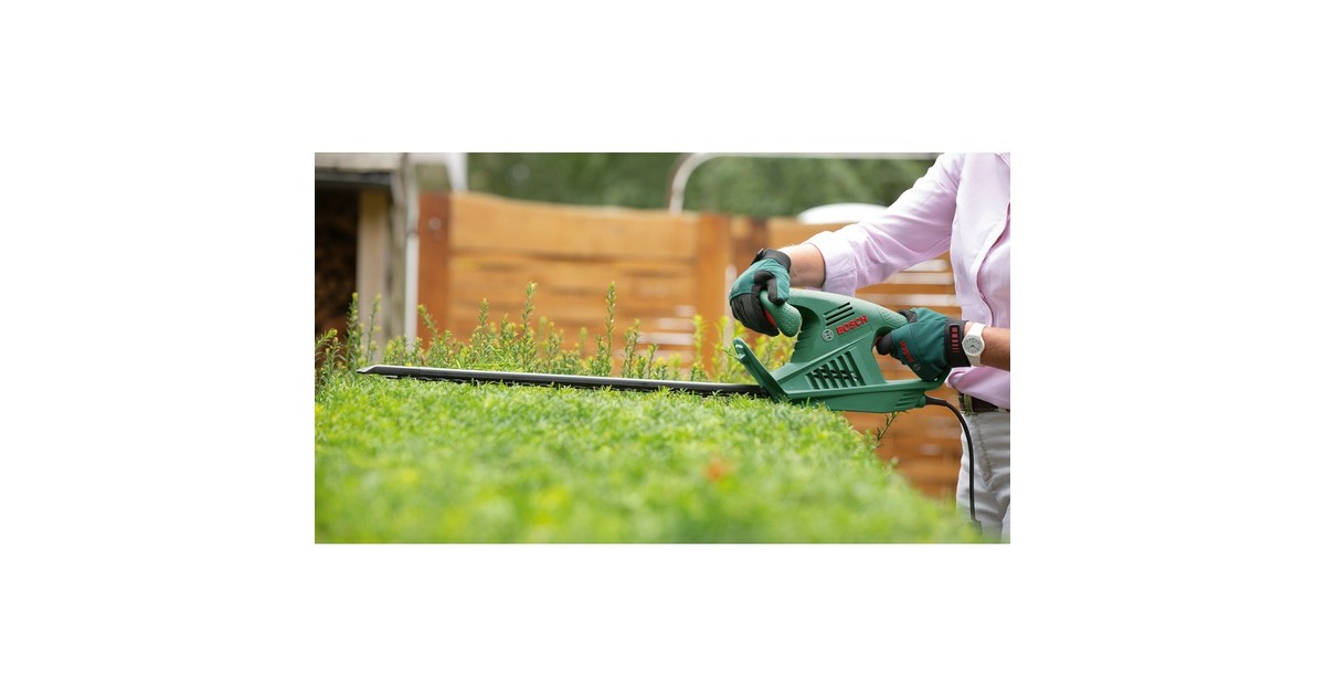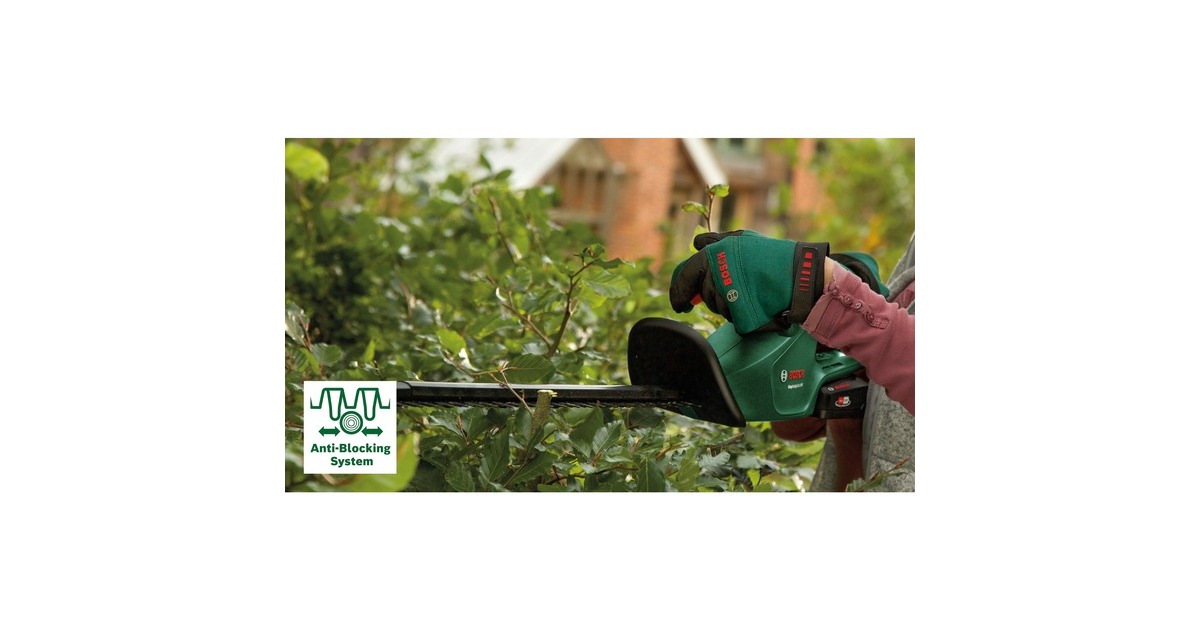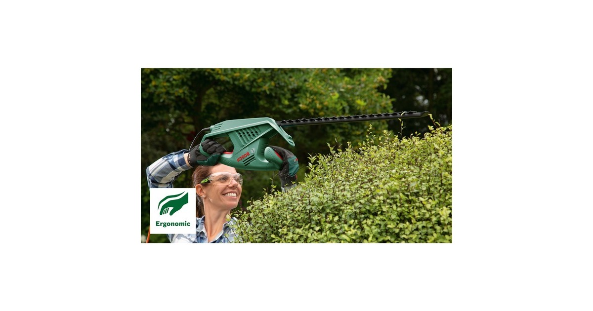 Die Heckenschere EasyHedgeCut 55 von Bosch ist leicht und gut ausbalanciert, ideal zum Trimmen kleiner bis mittelgroßer Hecken. Das geringe Gewicht und das kompakte Design erlauben einfaches Handling und perfekte Kontrolle in jeder Position. Der durchzugsstarke 450 Watt Motor sorgt für kraftvolle, schnelle und saubere Schnitte. Auch das Trimmen dickerer Äste ist ohne Unterbrechungen möglich, dank des Bosch Anti-Blockier-Systems. Der Messerschutz schützt die diamantgeschliffenen Messer bei Schnitten entlang von Mauern und am Boden.Art.-Nr.: 1827785