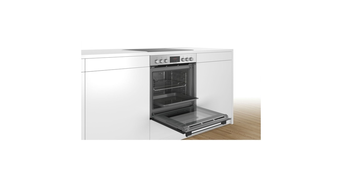 Das Herdset Bosch HND271AS62 überzeugt mit einem Backraumvolumen von 71 Litern und fünf Heizarten sowie einer zuschaltbaren Schnellaufheizfunktion. Das Set besteht aus dem Einbau-Herd HEA173BS2 und dem Elektro-Kochfeld NKN645GA1E. Die Bedienung mit rotem LED-Display gestaltet sich dank direktem Zugriff auf Zeitfunktionen besonders einfach. Die 3D-Heißluft sorgt für perfekte Backergebnisse auf bis zu drei Ebenen gleichzeitig dank optimaler Wärmeverteilung. Die AutoPilot 10 Automatikprogramme bereiten die Speisen automatisch perfekt zu. Dank Pyrolyse-Selbstreinigungsfunktion ist der Putzaufwand minimal. Das herdgesteuerte Elektro-Kochfeld NKN645GA1E mit umlaufendem Rahmen bietet vier HighSpeed-Kochzonen, davon eine Bräterzone und eine auf 21 cm erweiterbare Zweikreis-Kochzone. Die Glaskeramik-Oberfläche ist leicht zu reinigen.Art.-Nr.: 1830112