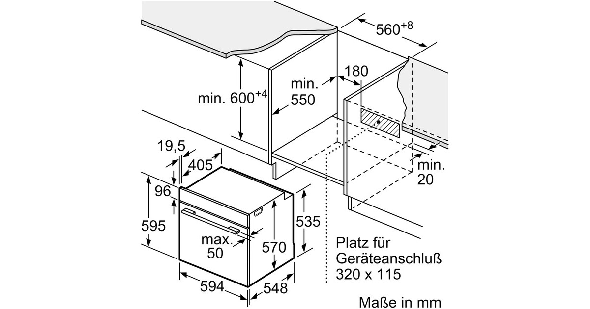 Gerätemaße Backofen (HxBxT): 595 x 594 x 548 mm, Nischenmaße Backofen (HxBxT): 600-604 x 560-568 x 550 mm, Anschlusswert Backofen: 11400 W; Gerätemaße Kochfeld (HxBxT): 43 x 583 x 513 mm, Einbaumaße Kochfeld: (HxBxT) 43 x 560 x 490 - 500 mm, Anschlusswert Kochfeld: 7800 W |