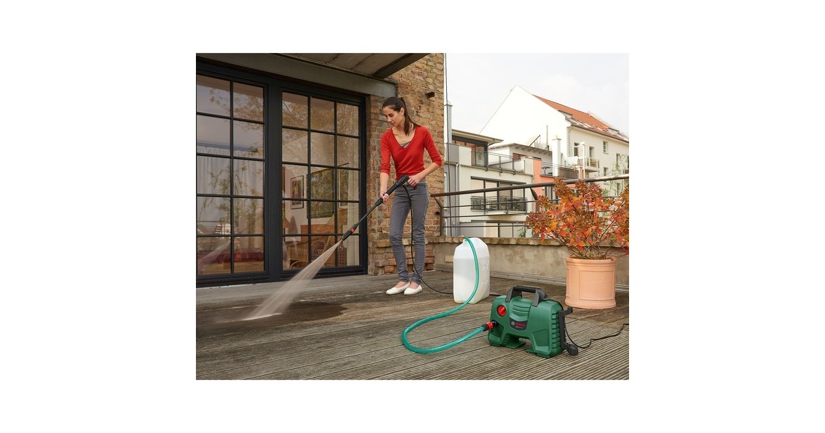 Der Hochdruckreiniger EasyAquatak 100 Lange Lanze von Bosch ermöglicht eine praktische 360°-Allround-Reinigung im Außenbereich. Die 360°-Pistole kann abgewinkelt werden, um auch schwer zugängliche Bereiche mühelos zu reinigen, und durch die Einhandbedienung bleibt die andere Hand für die manuelle Unterstützung der Reinigung frei. Die Reinigungskraft von 100 bar und die variable Flachstrahldüse erlauben ein einfaches Reinigen von Autos, Terrassen, Gartenmöbeln und vielem mehr. Dank der Selbstansaugfunktion kann man auch Wasser aus Behältern wie z.B. Regenwassertanks zum Reinigen verwenden. Die einstellbare Düse bietet vom kraftvollen Strahl bis zum sanften Abbrausen alle Zwischenstufen, und die Schnellkupplungen des EasyAquatak 100 Lange Lanze sorgen für höchsten Bedienkomfort.Art.-Nr.: 1828062