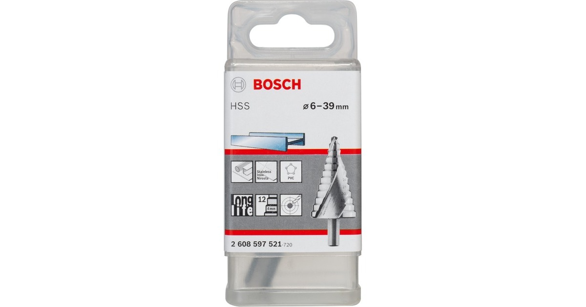 Der HSS-Stufenbohrer 2608597521 von Bosch bohrt glatte und gratfreie Löcher mit 12 verschiedenen Durchmessern. Er eignet sich auch zum Bohren und Vergrößern von Löchern. Ein Ankörnen ist nicht nötig, die Bohrspitze mit Kreuzanschliff erleichtert das Anbohren. Die CNC-gefräste Spiralnut entfernt optimal die Späne. Der Axiale und radiale Reliefschliff sorgt für höchste Scheideleistung und exakte glatte Ergebnisse. Der HSS-Stufenbohrer eignet sich für dünnes Material aus Nichteisenmetall, rostfreiem Stahl und Kunststoff, außerdem für Stahlblech und Kunststofftafeln. Er ist aus HSS-Stahl gefertigt und bei Verwendung von Kühlmittel ausgesprochen langlebig. Die gut erkennbaren, dauerhaften Durchmesser-Markierungen in beiden Spiralnuten sind gelasert. Der 3-Flächen-Schaft verhindert ein Durchrutschen im Bohrfutter und stellt die Übertragung hoher Drehmomente sicher.Art.-Nr.: 1163087