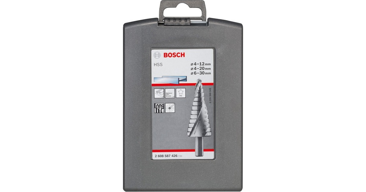 Das HSS-Stufenbohrer-Set 2608587426 von Bosch bohrt glatte und gratfreie Löcher. Die Stufenbohrer eignen sich auch zum Bohren und Vergrößern von Löchern. Ein Ankörnen ist nicht nötig, die Bohrspitze mit Kreuzanschliff erleichtert das Anbohren. Die CNC-gefräste Spiralnut entfernt optimal die Späne. Der Axiale und radiale Reliefschliff sorgt für höchste Scheideleistung und exakte glatte Ergebnisse. Das Set enthält zwei 9-stufige und einen 13-stufigen Bohrer. Die HSS-Stufenbohrer eignen sich für dünnes Material aus Nichteisenmetall, rostfreiem Stahl und Kunststoff, außerdem für Stahlblech und Kunststofftafeln. Sie sind aus HSS-Stahl gefertigt und bei Verwendung von Kühlmittel ausgesprochen langlebig. Die gut erkennbaren, dauerhaften Durchmesser-Markierungen in beiden Spiralnuten sind gelasert. Der Sechskant-Schaft verhindert ein Durchrutschen im Bohrfutter und stellt die Übertragung hoher Drehmomente sicher.Art.-Nr.: 1687240