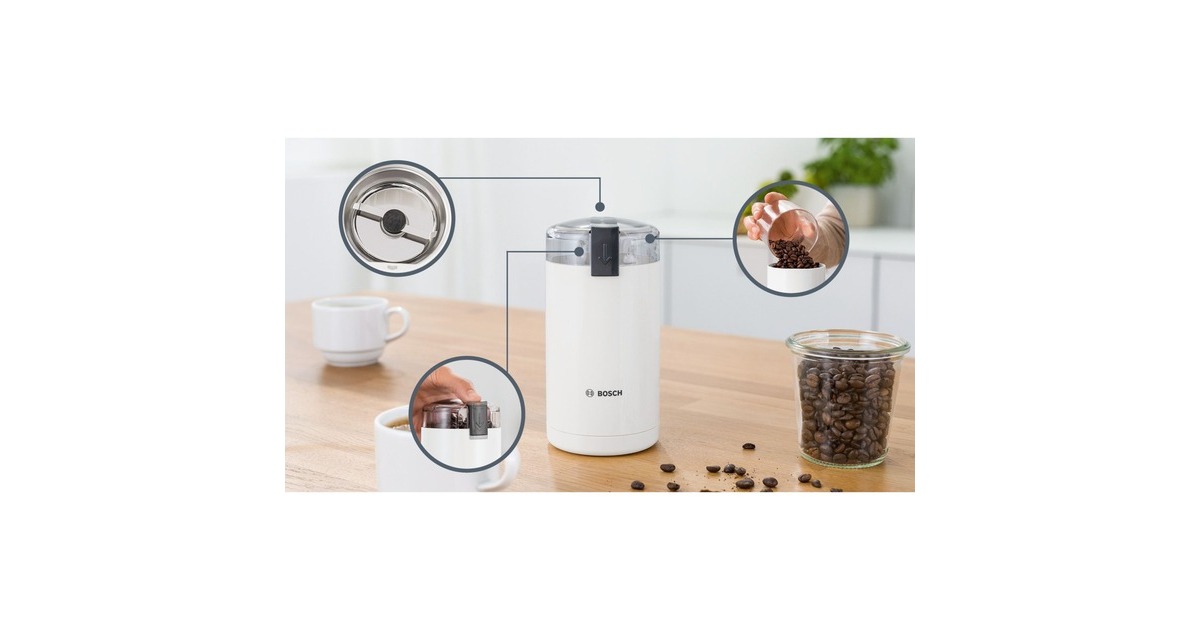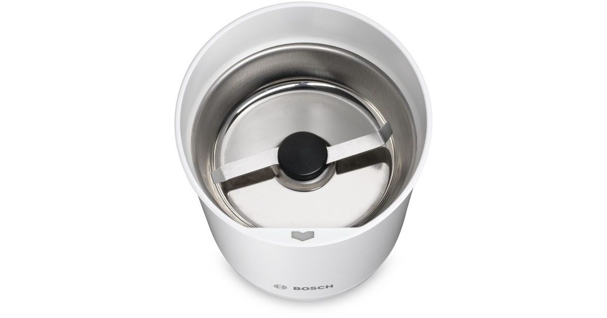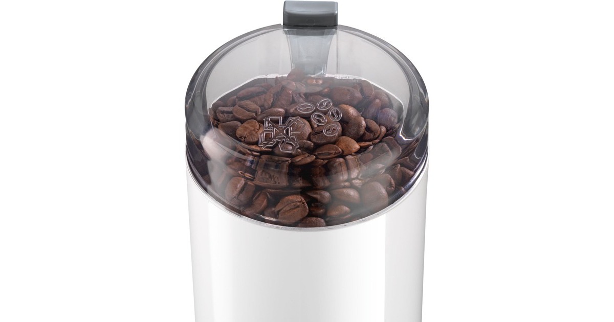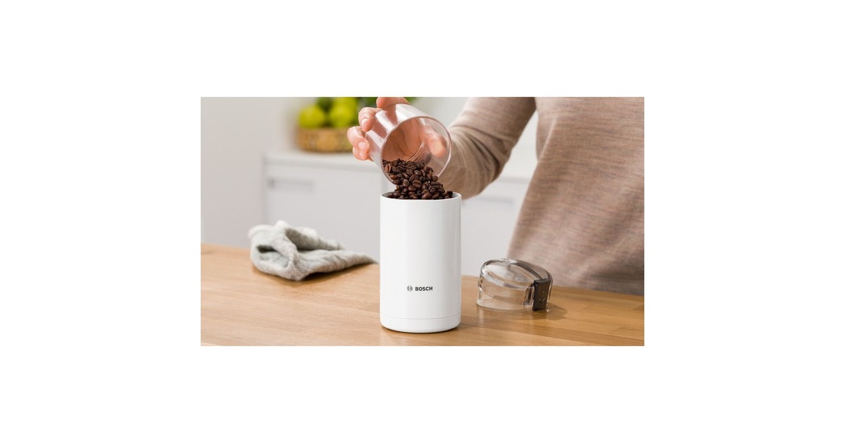 Die elektrische Kaffeemühle TSM6A011W von Bosch ist eine Kaffeemühle mit Schlagwerk und Bohnenbehälter aus Edelstahl. Der Behälter fasst bis zu 75g Bohnen, genug für eine ganze Kanne Kaffee. Der Motor hat eine Leistung von 180 Watt und durch den transparenten Deckel hat man den aktuellen Mahlgrad immer im Blick. Über die Mahldauer lässt sich der Mahlgrad anpassen.