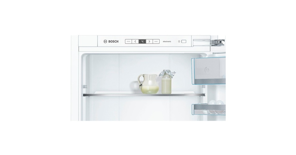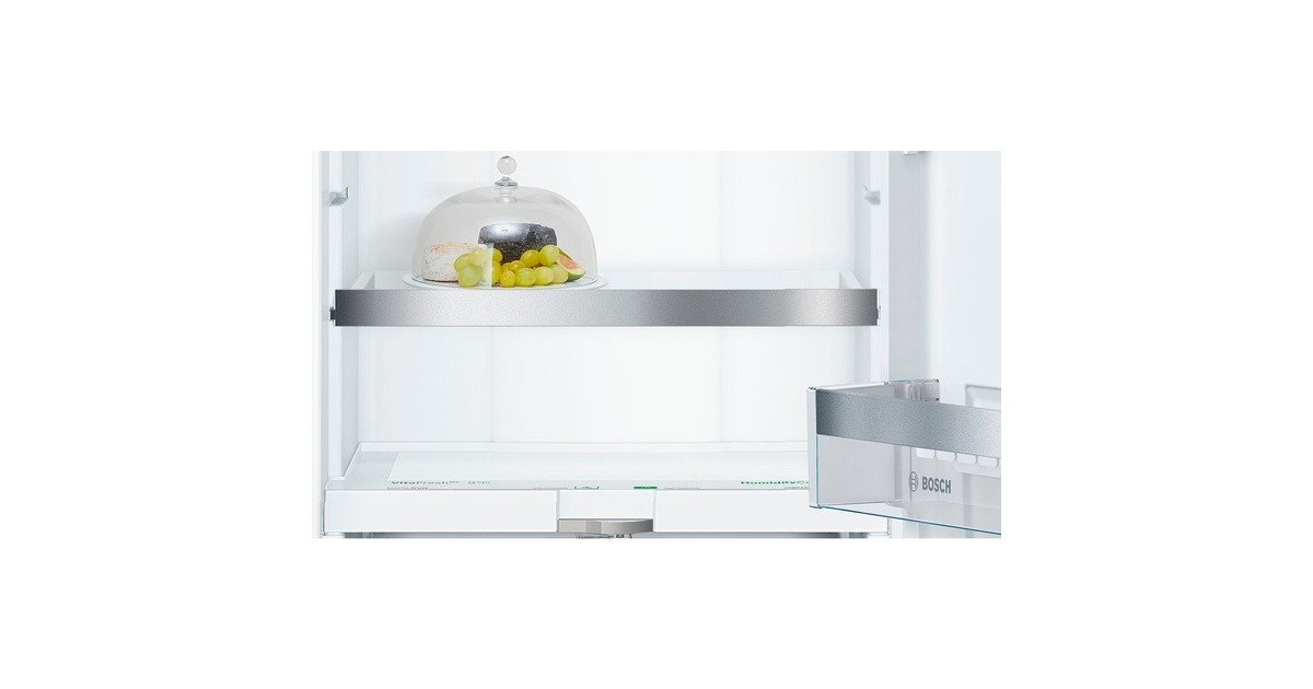 Der vollintegrierbare Kühlschrank Bosch KIF41ADD0 stellt einen Gesamtnutzinhalt von 187 Litern zur übersichtlichen Lagerung frischer Lebensmittel zur Verfügung. Ausgestattet ist er mit vier Abstellflächen aus Sicherheitsglas, davon drei höhenverstellbar, eine ausziehbar (EasyAccess Shelf) und eine teilbar mit Parkmöglichkeit im Gerät (VarioShelf), sowie drei Türfächern, davon ein Butter-/Käsefach. Zwei VitaFresh pro 0°C Schubladen - davon eine "taufrisch" mit aktiver Feuchteregulierung für Obst und Gemüse und eine für Fisch und Fleisch - halten die Lebensmittel bis zu dreimal länger frisch und knackig. Die intelligente Sensortechnik FreshSense sorgt im gesamten Kühlraum für eine konstante Temperatur und mit der SuperKühlen-Funktion wird die Temperatur für eine eingestellte Zeit gesenkt, sodass beim Einlagern wärmerer Lebensmittel ein unerwünschter Temperaturanstieg bereits gekühlter Speisen verhindert wird. Mit einem Stromverbrauch von 110 kWh im Jahr ist der KIF41ADD0 in die Energieeffizienzklasse D eingestuft.Art.-Nr.: 1668712