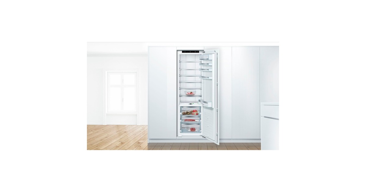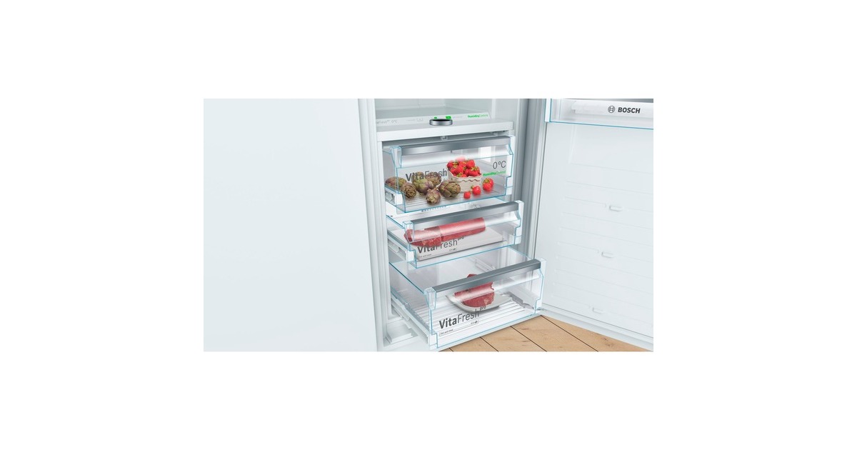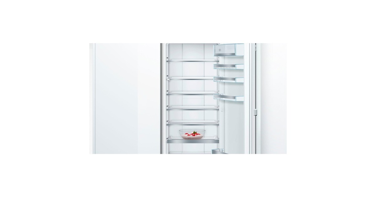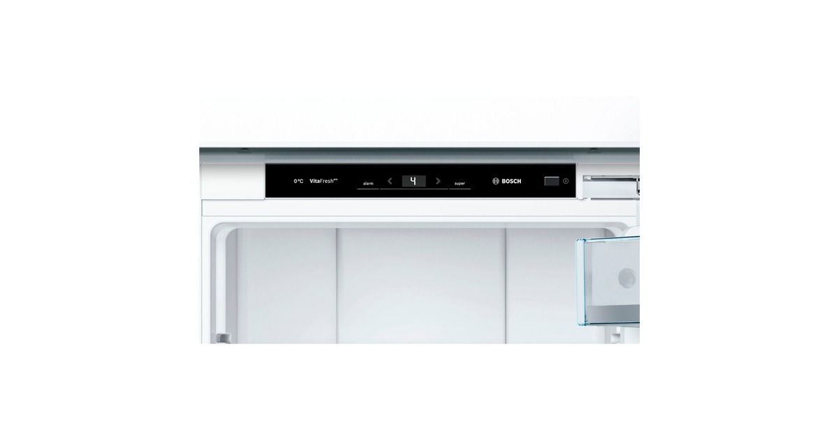 Der vollintegrierbare Kühlschrank Bosch KIF81PFE0 stellt einen großzügigen Gesamtnutzinhalt von 289 Litern zur übersichtlichen Lagerung frischer Lebensmittel zur Verfügung. Ausgestattet ist er mit sieben Abstellflächen aus Sicherheitsglas, davon sechs höhenverstellbar und eine ausziehbar (EasyAccess Shelf), sowie fünf Türfächern, davon ein Butter-/Käsefach. Drei VitaFresh pro 0°C Schubladen - davon eine "taufrisch" mit aktiver Feuchteregulierung für Obst und Gemüse und zwei "trocken" für Fisch und Fleisch - halten die Lebensmittel bis zu dreimal länger frisch und knackig. Die intelligente Sensortechnik FreshSense sorgt im gesamten Kühlraum für eine konstante Temperatur und mit der SuperKühlen-Funktion wird die Temperatur für eine eingestellte Zeit gesenkt, sodass beim Einlagern wärmerer Lebensmittel ein unerwünschter Temperaturanstieg bereits gekühlter Speisen verhindert wird. Mit einem Stromverbrauch von 150 kWh im Jahr ist der KIF81PFE0 in die Energieeffizienzklasse E eingestuft.Art.-Nr.: 1668713