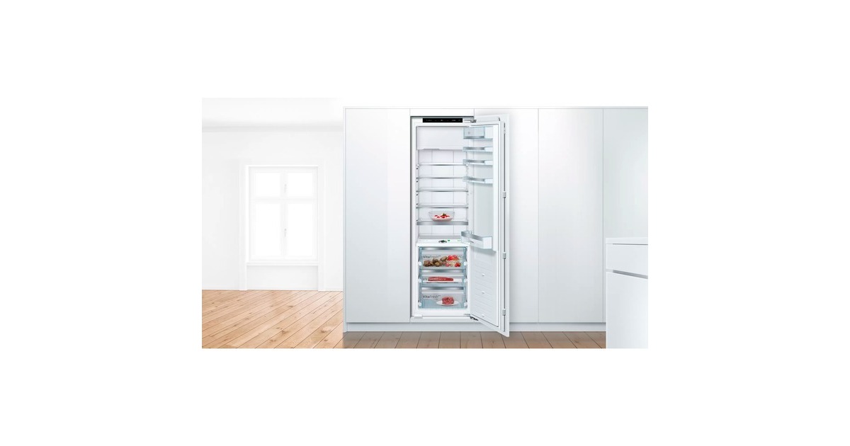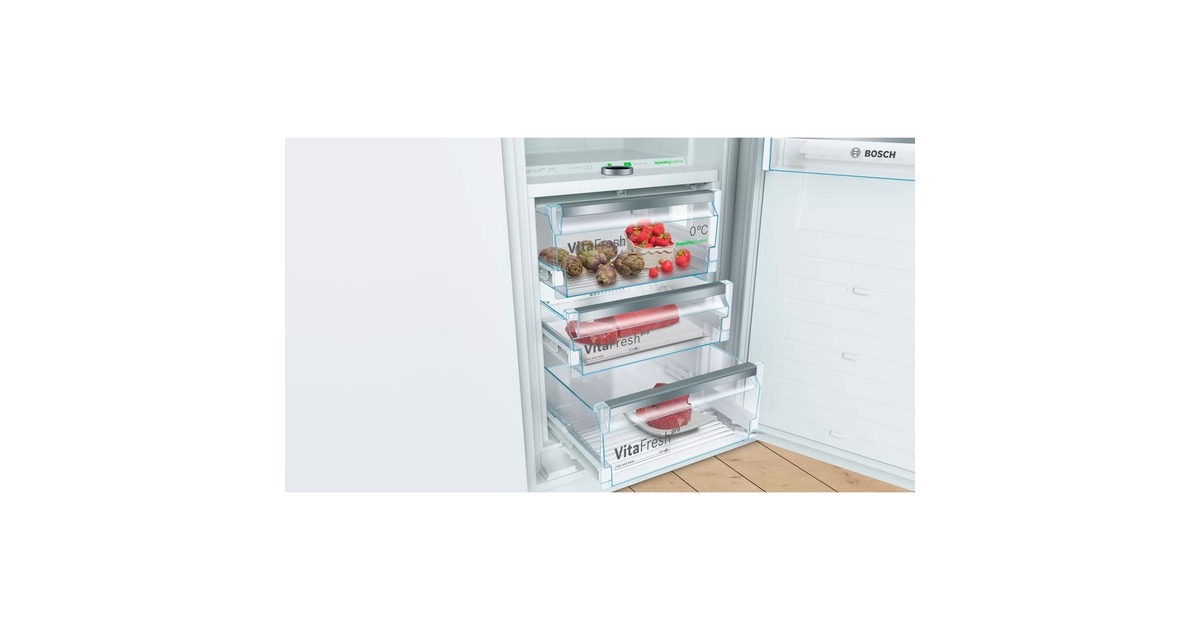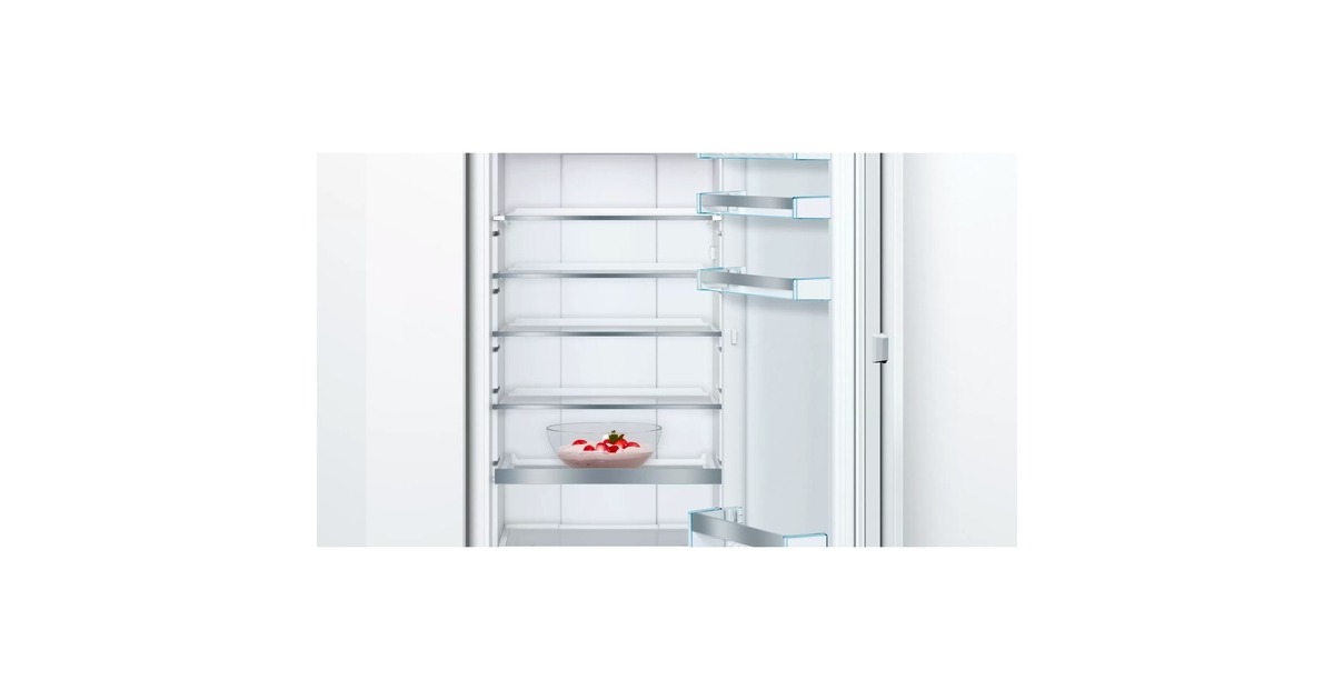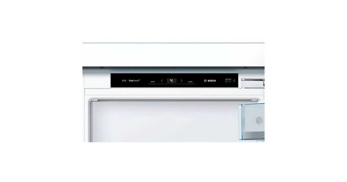Der vollintegrierbare Kühlschrank Bosch KIF82PFE0 stellt einen Gesamtnutzinhalt von 269 Litern für die übersichtliche Lagerung von Lebensmittel und Getränken zur Verfügung. Ausgestattet ist er mit sechs Abstellflächen aus Sicherheitsglas, davon fünf höhenverstellbar und eine ausziehbar (Easy Access Shelf), sowie fünf Türfächern, davon ein Butter-/Käsefach. Drei VitaFresh pro 0°C Schubladen, davon eine mit Feuchteregulierung für Obst und Gemüse und zwei für Fisch und Fleisch, halten frische Lebensmittel deutlich länger frisch und knackig. Die SuperKühlen-Funktion kühlt neu eingelegte Lebensmittel schneller und bietet so Schutz für bereits Gekühltes. Das 4-Sterne-Gefrierfach mit Klappe bietet auf 15 Litern Nutzinhalt Platz für Gefriergut. Die Temperaturregelung erfolgt mittels TouchControl und ist exakt digital ablesbar. Mit einem Stromverbrauch von 184 kWh im Jahr ist der KIF82PFE0 in die Energieeffizienzklasse E eingestuft.Art.-Nr.: 100021206