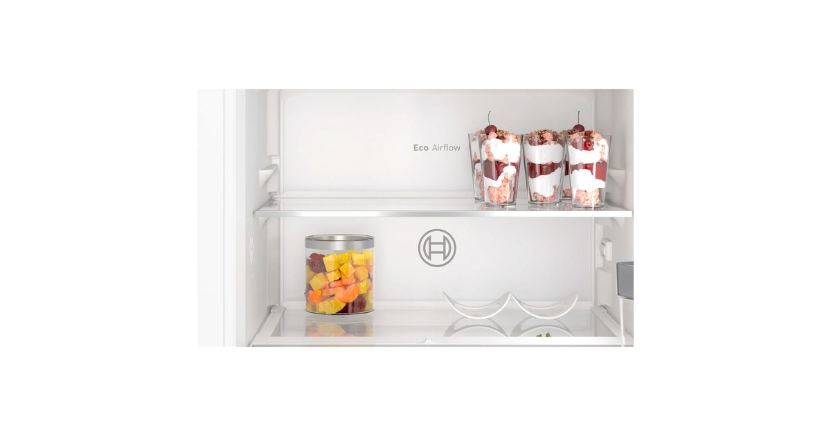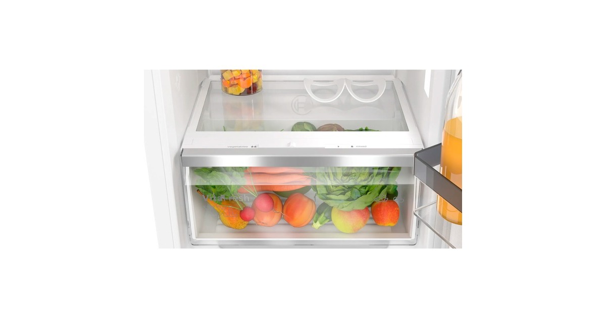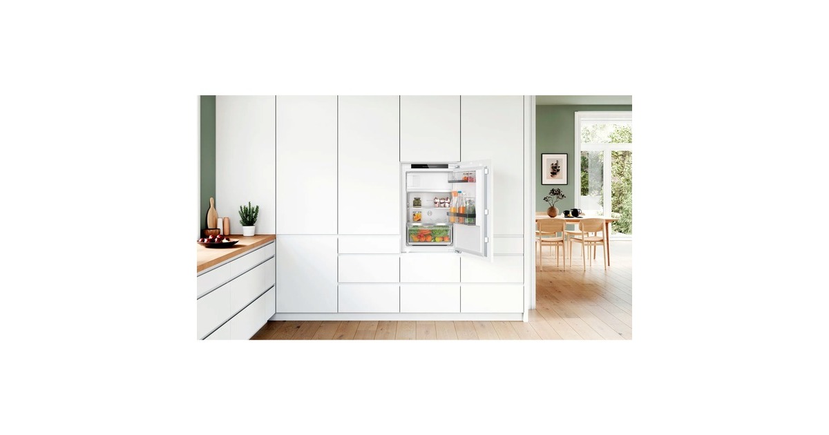 Der Einbau-Kühlschrank Bosch KIL22ADD1 ist mit einem Gesamtnutzinhalt von 119 Litern ideal für den mittelgroßen Haushalt geeignet und lässt sich dank seines wechselbaren Türanschlags flexibel in die Küchen integrieren. Ausgestattet ist er mit zwei Abstellflächen aus Sicherheitsglas, davon eine höhenverstellbar, sowie zwei Türfächern. Die VitaFresh XXL Schublade mit Feuchtigkeitsregulierung hält Obst und Gemüse vitaminreich und länger frisch. Eco Airflow sorgt für optimale Luftzirkulation und ein konstantes Temperaturniveau im Kühlbereich und mit der SuperKühlen-Funktion wird die Temperatur per Knopfdruck abgesenkt (mindestens 2°C), damit die frischen Einkäufe auf der richtigen Temperatur bleiben. Das 4-Sterne-Gefrierfach mit Klappe bietet auf 15 Litern Platz für Gefriergut. Innerhalb von 24 Stunden können hier bis zu 3 Kilogramm Lebensmittel eingefroren werden, welche im Falle einer Störung oder eines Stromausfalls noch bis zu 10 Stunden vor dem Auftauen geschützt bleiben. Mit einem Stromverbrauch von 115 kWh im Jahr ist der KIL22ADD1 in die Energieeffizienzklasse D eingestuft.Art.-Nr.: 100021253