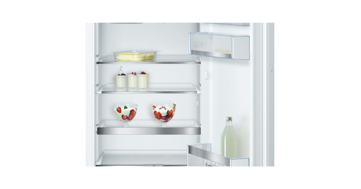 Der Einbau-Kühlschrank Bosch KIL72AFE0 stellt einen großzügigen Gesamtnutzinhalt von 248 Litern zur übersichtlichen Lagerung frischer Lebensmittel zur Verfügung. Ausgestattet ist er mit vier Abstellflächen aus Sicherheitsglas, davon drei höhenverstell- und eine ausziehbar, sowie vier Türfächern, davon ein Butter-/Käsefach. Die VitaFresh plus Schublade auf Teleskopschienen mit Feuchtigkeitsregulierung hält Obst und Gemüse dank optimaler Luftfeuchtigkeit bis zu zweimal länger frisch und vitaminreich und die MultiBox auf Teleskopschienen mit Wellenboden ist ebenfalls ideal zur Lagerung von Obst und Gemüse geeignet. Das pizzagerechte 4-Sterne-Gefrierfach mit Klappe bietet auf 34 Litern Nutzinhalt Platz für Gefriergut. Die intelligente Sensortechnik FreshSense sorgt im gesamten Kühlraum für eine konstante Temperatur und mit der SuperKühlen-Funktion wird die Temperatur für eine eingestellte Zeit gesenkt, sodass beim Einlagern wärmerer Lebensmittel ein unerwünschter Temperaturanstieg bereits gekühlter Speisen verhindert wird. Mit einem Stromverbrauch von 174 kWh im Jahr ist der KIL72AFE0 in die Energieeffizienzklasse E eingestuft.Art.-Nr.: 1668739