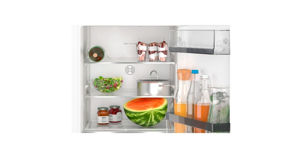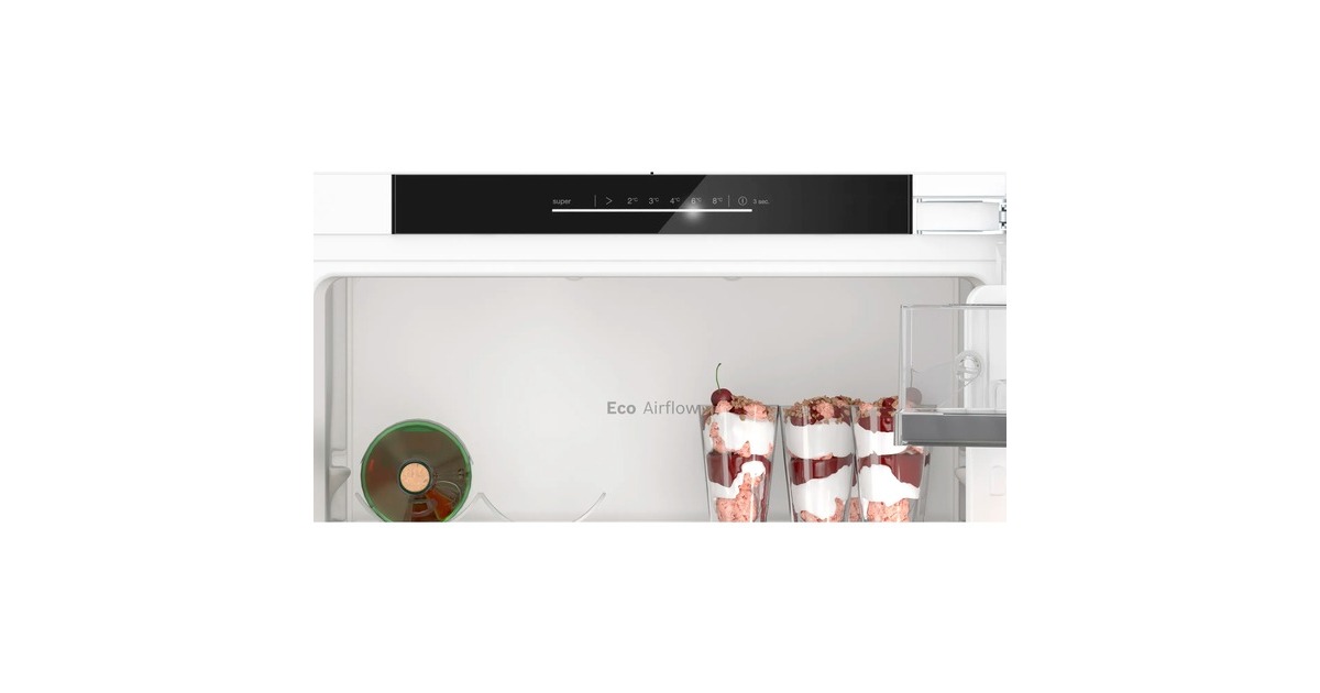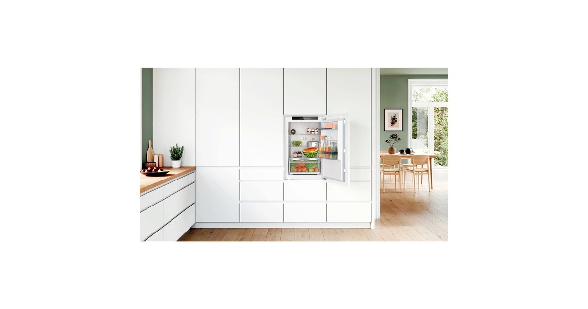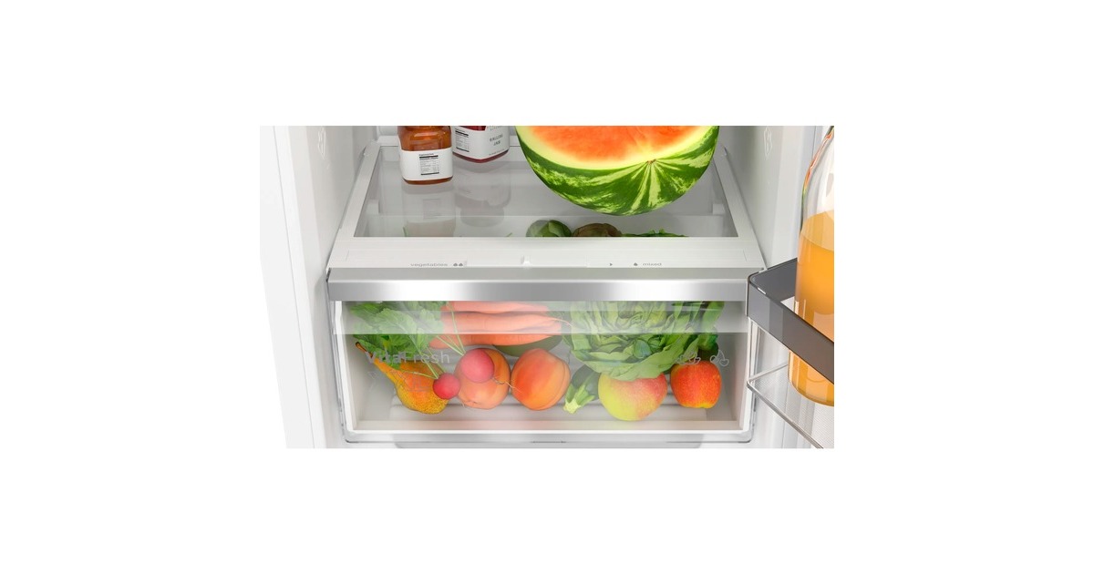 Der Einbau-Vollraumkühlschrank Bosch KIR21ADD1 ist mit einem Gesamtnutzinhalt von 136 Litern ideal für den kleinen Haushalt geeignet und lässt sich dank seines wechselbaren Türanschlags flexibel in die Küchen integrieren. Ausgestattet ist er mit drei Abstellflächen aus Sicherheitsglas, davon zwei höhenverstellbar, sowie zwei Türfächern. Die VitaFresh XXL Schublade mit Feuchtigkeitsregulierung hält Obst und Gemüse vitaminreich. Eco Airflow sorgt für eine optimale Luftzirkulation und konstante Temperatur im Kühlbereich und mit der SuperKühlen-Funktion wird die Temperatur per Knopfdruck abgesenkt (mindestens 2°C), damit die frischen Einkäufe auf der richtigen Temperatur bleiben. Mit einem Stromverbrauch von 74 kWh im Jahr ist der KIR21ADD1 in die Energieeffizienzklasse D eingestuft.Art.-Nr.: 100021270