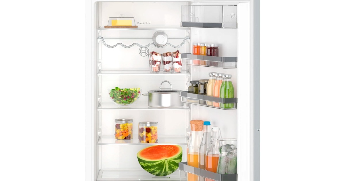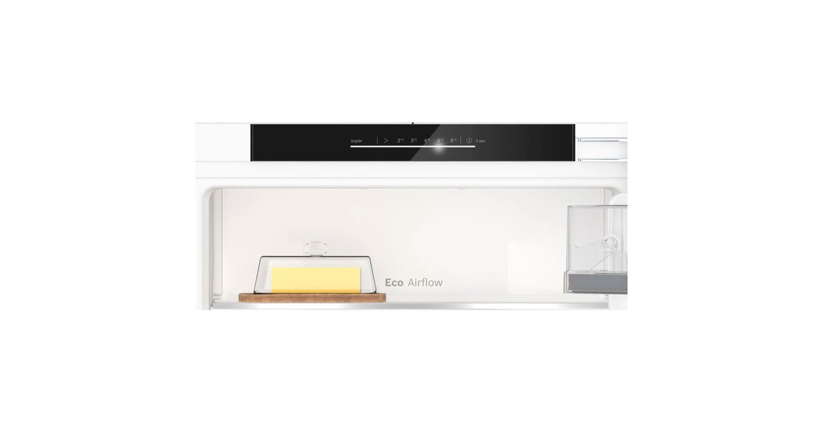Der Einbau-Vollraumkühlschrank Bosch KIR41ADD1 ist mit einem Gesamtnutzinhalt von 204 Litern ideal für den mittelgroßen Haushalt geeignet und lässt sich dank seines wechselbaren Türanschlags flexibel in die Küchen integrieren. Ausgestattet ist er mit fünf Abstellflächen aus Sicherheitsglas, davon vier höhenverstellbar, sowie vier Türfächern. Die VitaFresh XXL Schublade mit Feuchtigkeitsregulierung hält Obst und Gemüse vitaminreich und länger frisch und das Vario Shelf ist eine teilbare und unterschiebbare Glasplatte, die so Platz für Flaschen und Schüsseln bietet. Eco Airflow sorgt für eine optimale Luftzirkulation und konstante Temperatur im Kühlbereich und mit der SuperKühlen-Funktion wird die Temperatur per Knopfdruck abgesenkt (mindestens 2°C), damit die frischen Einkäufe auf der richtigen Temperatur bleiben. Mit einem Stromverbrauch von 81 kWh im Jahr ist der KIR41ADD1 in die Energieeffizienzklasse D eingestuft.Art.-Nr.: 100021278