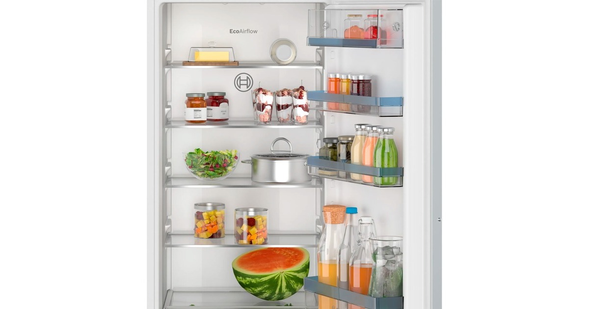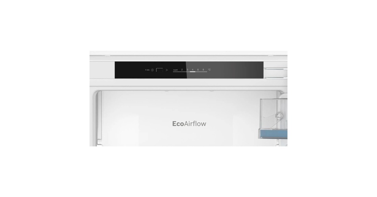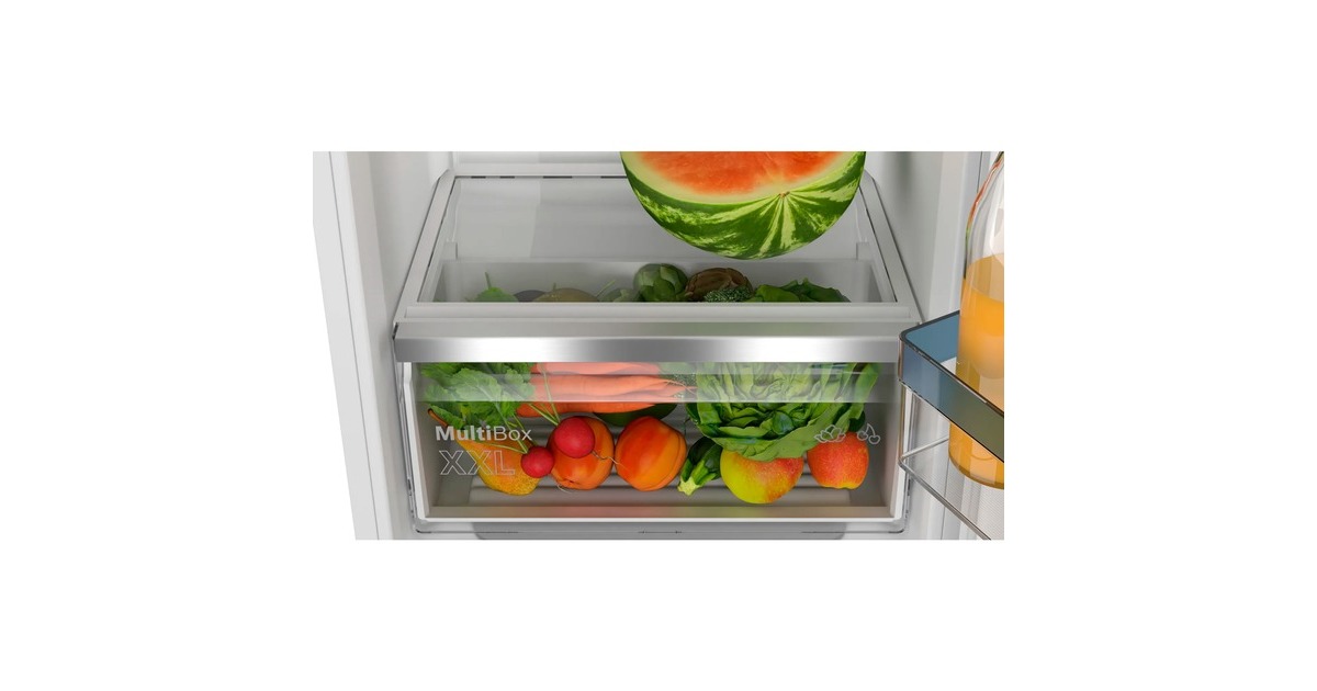 Der Einbau-Vollraumkühlschrank Bosch KIR41VFE0 ist mit einem Gesamtnutzinhalt von 204 Litern ideal für den mittelgroßen Haushalt geeignet und lässt sich dank seines wechselbaren Türanschlags flexibel in die Küchen integrieren. Ausgestattet ist er mit fünf Abstellflächen aus Sicherheitsglas, davon vier höhenverstellbar, einer transparenten MultiBox XXL mit Wellenboden für Obst und Gemüse sowie vier Türfächern. Eco Airflow sorgt für optimale Luftzirkulation und ein konstantes Temperaturniveau und Fresh Sense passt die Innentemperatur des Kühlschranks entsprechend den Veränderungen der Außentemperatur an. Mit der SuperKühlen-Funktion wird die Temperatur per Knopfdruck abgesenkt (mindestens 2°C), damit die frischen Einkäufe auf der richtigen Temperatur bleiben. Mit einem Stromverbrauch von 101 kWh im Jahr ist der KIR41VFE0 in die Energieeffizienzklasse E eingestuft.Art.-Nr.: 100021304