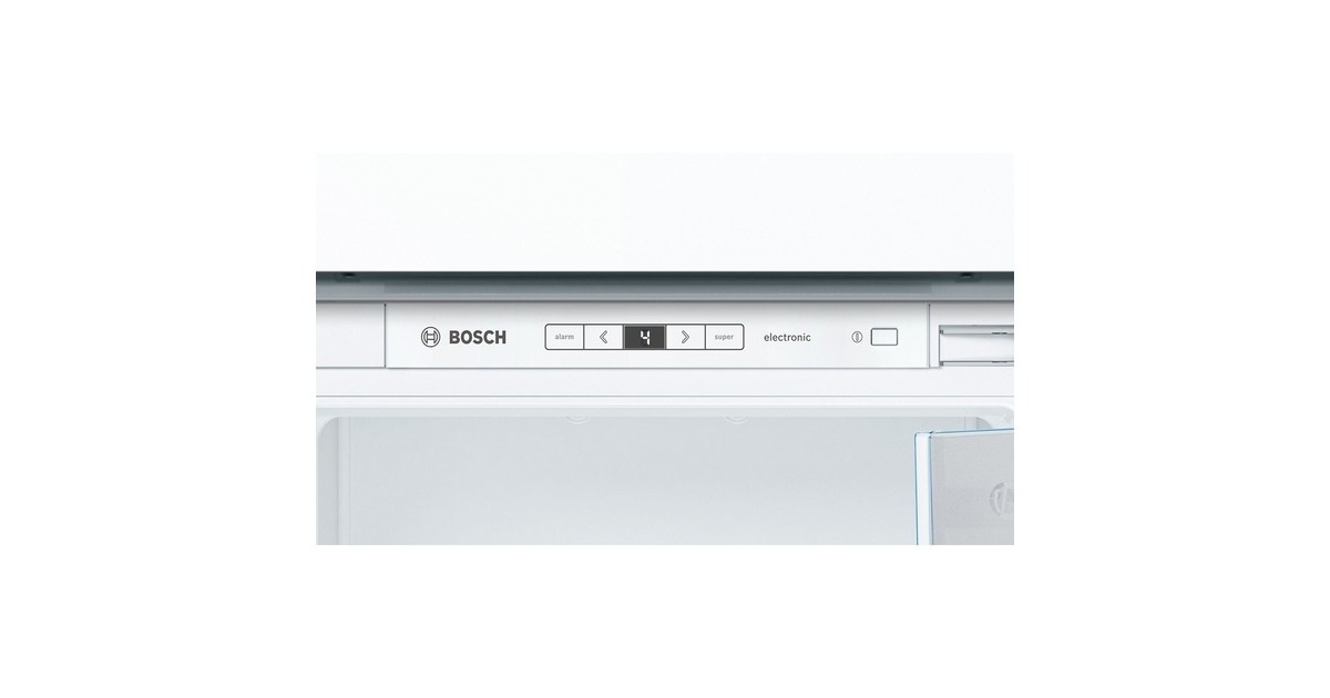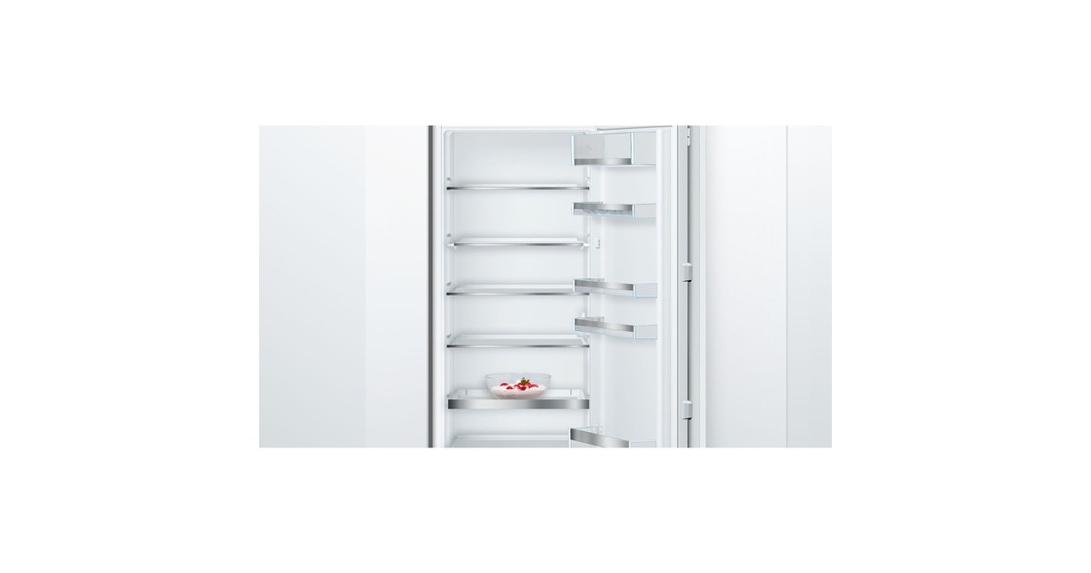 Der Einbau-Kühlschrank Bosch KIR51ADE0 stellt einen großzügigen Gesamtnutzinhalt von 247 Litern für die übersichtliche Lagerung frischer Lebensmittel zur Verfügung und lässt sich dank seiner kompakten Maße auch in kleine Küchen integrieren. Ausgestattet ist er mit sechs Abstellflächen aus Sicherheitsglas, davon fünf höhenverstell- und eine ausziehbar (EasyAccess Shelf), sowie fünf Türfächern, davon ein Butter-/Käsefach. Die VitaFresh plus Schublade hält Obst und Gemüse dank optimaler Luftfeuchtigkeit bis zu zweimal länger frisch. FreshSense sorgt dank intelligenter Sensortechnik im gesamten Kühlraum für eine konstante Temperatur und mit der SuperKühlen-Funktion wird die Temperatur für eine eingestellte Zeit gesenkt, sodass beim Einlagern wärmerer Lebensmittel ein unerwünschter Temperaturanstieg bereits gekühlter Speisen verhindert wird. Mit einem Stromverbrauch von 106 kWh im Jahr ist der KIR51ADE0 in die Energieeffizienzklasse E eingestuft.Art.-Nr.: 1668789