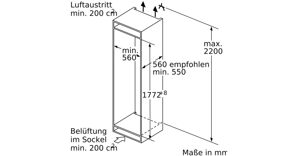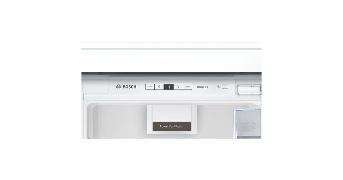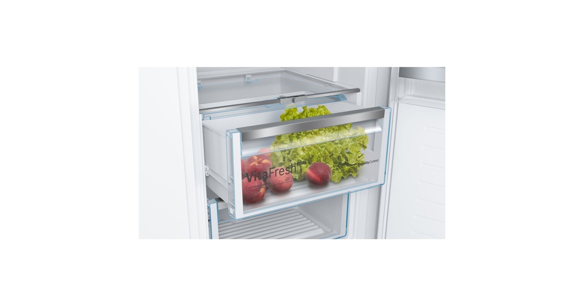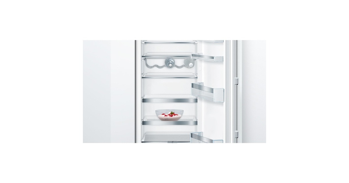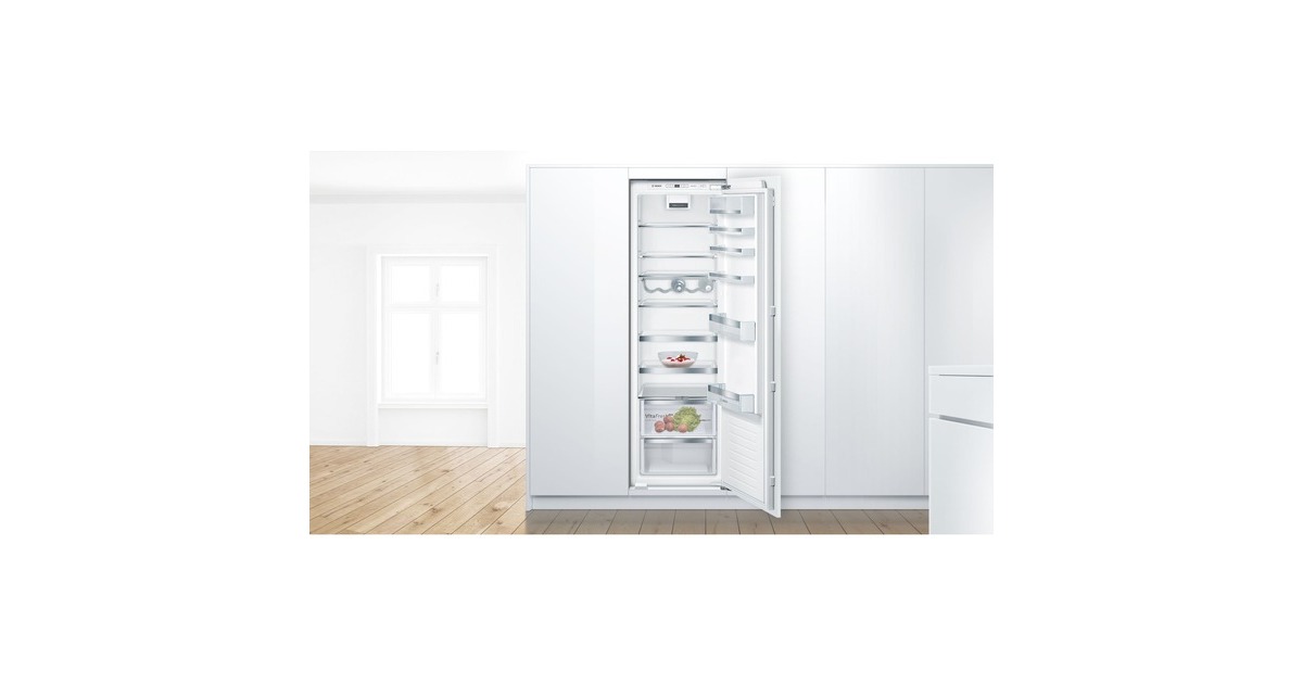 Der Einbau-Kühlschrank Bosch KIR81AFE0 stellt einen großzügigen Gesamtnutzinhalt von 319 Litern für die übersichtliche Lagerung frischer Lebensmittel zur Verfügung und lässt sich dank seiner kompakten Maße auch in kleine Küchen integrieren. Ausgestattet ist er mit sieben Abstellflächen aus Sicherheitsglas, davon sechs höhenverstell- und zwei ausziehbar (EasyAccess Shelf), sowie sechs Türfächern, davon ein Butter-/Käsefach. Die VitaFresh plus Schublade auf Teleskopschienen mit Feuchtigkeitsregulierung hält Obst und Gemüse dank optimaler Luftfeuchtigkeit bis zu zweimal länger frisch und vitaminreich und die MultiBox auf Teleskopschienen mit Wellenboden ist ebenfalls ideal zur Lagerung von Obst und Gemüse geeignet. FreshSense sorgt dank intelligenter Sensortechnik im gesamten Kühlraum für eine konstante Temperatur und mit der SuperKühlen-Funktion wird die Temperatur für eine eingestellte Zeit gesenkt, sodass beim Einlagern wärmerer Lebensmittel ein unerwünschter Temperaturanstieg bereits gekühlter Speisen verhindert wird. Mit einem Stromverbrauch von 115 kWh im Jahr ist der KIR81AFE0 in die Energieeffizienzklasse E eingestuft.Art.-Nr.: 1668790