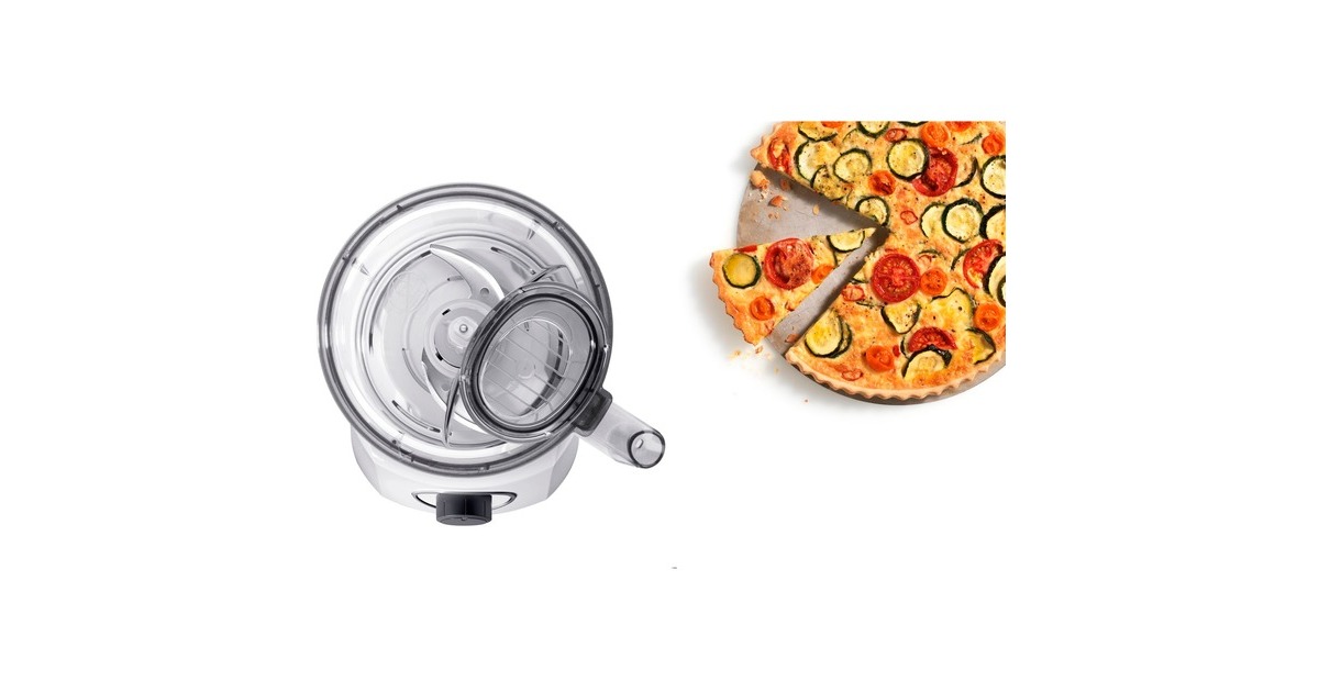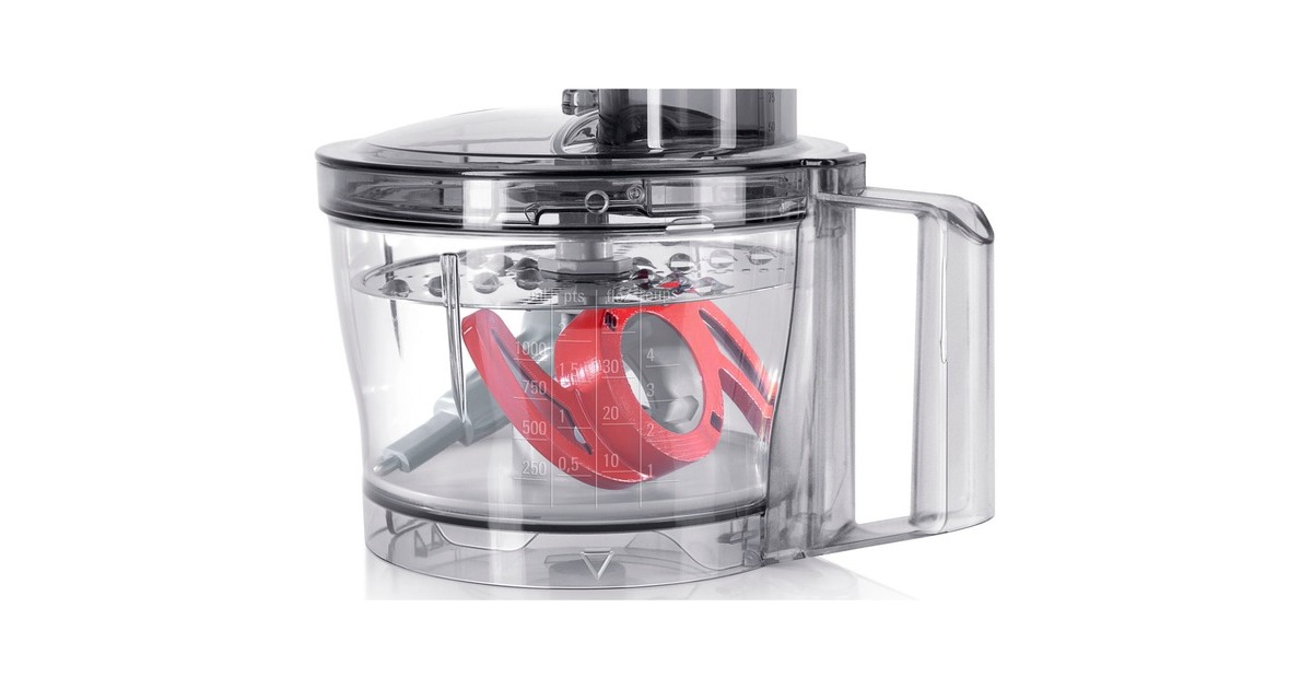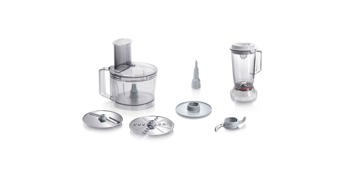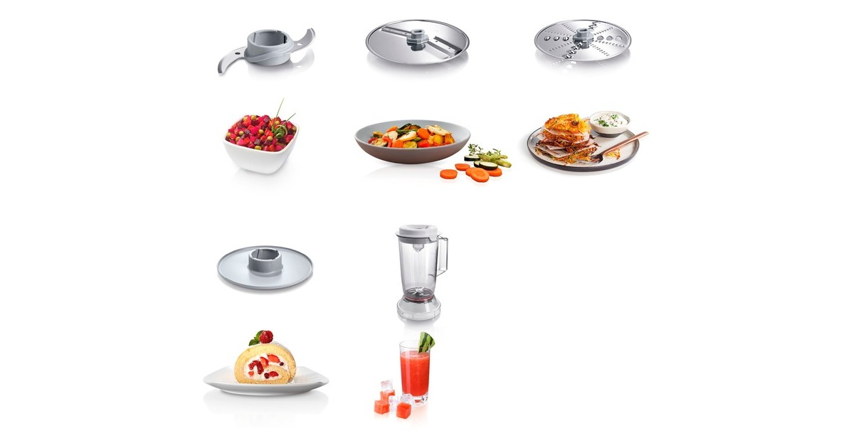 Rührschüssel, Deckel mit Einfüllhilfe und Stopfer, Mixer-Aufsatz, Schneid-Wendescheibe (dick und dünn), Raspel-Wendescheibe (grob und fein), Schlagscheibe |