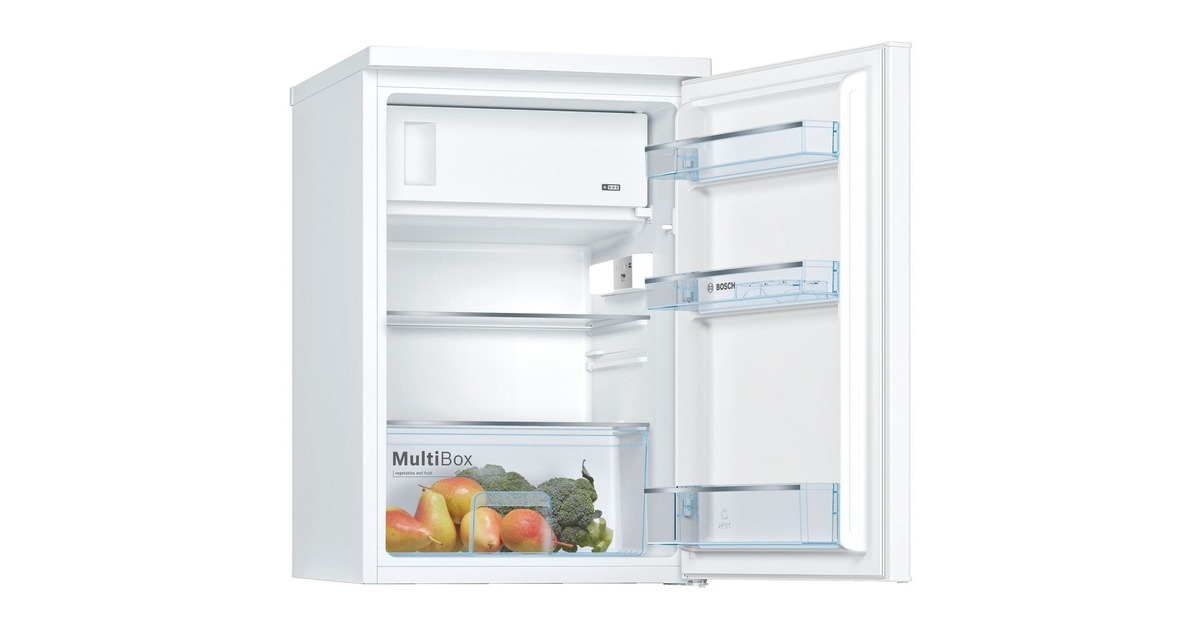 Der Kühlschrank Bosch KTL15NWEA ist mit einem Gesamtnutzinhalt von 120 Litern ideal für den Single-Haushalt geeignet. Im Kühlraum bieten zwei Abstellflächen aus Sicherheitsglas, davon eine höhenverstellbar, eine transparente Obst-/Gemüseschublade mit Wellenboden und drei Türfächer ausreichend Platz für frische Lebensmittel. Das 4-Sterne-Gefrierfach mit Klappe stellt einen Nutzinhalt von 14 Litern zur Verfügung und friert innerhalb von 24 Stunden bis zu 5 Kilogramm Lebensmittel ein. Die Temperaturregelung des KTL15NWEA erfolgt elektronisch. Mit einem Stromverbrauch von 139 kWh im Jahr ist der KTL15NWEA in die Energieeffizienzklasse E eingestuft.Art.-Nr.: 1744506